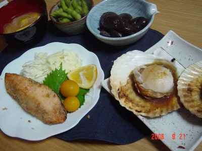 PCに弱いもので・・ 晩御飯画像ため込んでます。アップできるかな?駅前のスーパーの魚屋さんが変わったみたいでいいお魚が並んでました。4個で480円の殻つきホタテ買っちゃいました。ガーリックバターしょうゆ焼きにしました鮭フライ、なすの煮物、ジャガイモとたまねぎの味噌汁 枝豆 パパがご飯が要らないというので思いっきり手を抜きました。先日のロンジン豚を乗せたサラダと明太子とぶなピーのパスタそしてひじきの煮物 これは今日のです。お義母さんが大間に旅行して買ってきてくれたマグロのステーキ(レトルト)ひじき、マグロの赤身の刺身 あられ揚げのサラダ小松菜の味噌汁 枝豆。時間と体力がなかったので切っただけ、ゆでただけ、焼いただけ、残り物。今日は朝から背骨から寝違ったように痛くて最初は理由がわからなかったけど昨日のジョギングがものすごく気持ちよくて飛ばしちゃったせいらしい。たまに自分の年と運動不足を忘れて昔のように走ってしまって後悔します。これでは運動会で転ぶお父さんと同じ・・。娘は季節の変わり目にはよく出る喘息パパは仕事の打ち上げで二日酔いそんななのでみんなで映画を見て静かに過ごす事にしました。娘が見たいと言うので、スターウォーズエピソード3これで私とパパは6作全部見ました。これでなぞが解けました。でも娘は戦いのところ以外は難しかったみたい。そして今、パンが焼けました。今マイブームのミルクをたっぷり入れたプチパンスキムミルクをいっぱい入れた以外は塩と少しの砂糖だけ今日のはこだわって、春豊、浜御塩の藻塩、赤糖で・・。