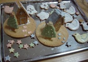 クッキーでクリスマスの準備 第2段昨日までに焼きためておいた、でも大分胃に治まってしまったのでそんなに数の残ってないクッキーたちをアイシングで飾りました。先日家だけだったけど、今日は庭付きです。それから壁に飾ろうかと思ってるクッキー達乾燥剤を入れてしっかりシールしたビニールに入れてリボンで吊るとクリスマスまで目を楽しませてくれるかな・・・。