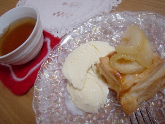 今日は、家の中のことが少しバタバタしてるにもかかわらず、バーゲンにいってきました。去年はたしかバーゲンに行っても布地しか買ってこなかったけど今年はコートをゲットできました。それから少し雑貨とか見てきました。友人に会ったので、ランチして来ちゃいました。こういう時間は本当に楽しいですね。家のバタバタ(修理が必要なものがあるんです・・)もつかの間、忘れられてよかったーー。つかれて帰ってきたら甘いものが食べたくなったので冷凍庫をかき回すと・・・パイを作った時に残り生地でパイカップを作っておいたものとアップルパイを作った時に煮ておいた林檎発見!!林檎を載せて焼きなおして、ハーゲンダッツを添えて・・。これはかなりハイレベルなアップルパイアラモード!!自我自賛ですが・・・。残った生地の有効利用も出来てホクホクでした。