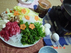 1、牛肉 2、白菜 3、葱 4、白滝 5、春菊 6、ほうれん草 7、ニンジン 8、豆腐 9、お餅 10、うどん 11、卵 12、キムチ 13、しいたけ