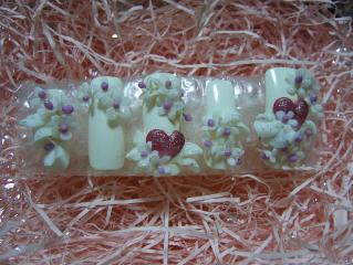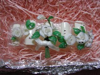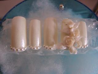 3Dデコパージュは、オタクな私がもっとも得意?と言うか、単純に好きな作業です。自分の世界に入り、ひたすら黙々と作業・・・。食事ナシ水分ナシ休憩ナシで1日はやれます!ネイルの仕事を始めた頃から、そして今も、ブライダルのオーダーチップ専門で仕事が出来たらなぁ、と思う位で。習い始めの頃は、デコデコゴテゴテ引っ付けてましたが、月日を重ねるうちに”バランス”と言うものに気付き・・・、これはその頃作ったサンプルです(^^ゞ自分の結婚式は、シンプルなごく普通のフレンチスカルプでしたが、今だったら、コレ私的にかなりストライクゾーンです