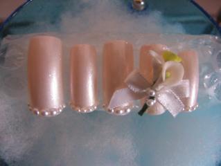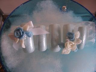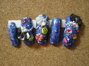 ”サムシングブルー”にこだわって青ばっかり作っていました。義妹の結婚式に、これの色違いのパステルピンクをプレゼントしました。サンプルから選ばれて、デザインはそのまま、カラーチェンジは義妹のオーダーだったんですが、実際はサンプルよりも短いチップで作ったので、コロコロと砂糖菓子チックになり、ピンクにチェンジして大正解とっても可愛かったです。デザインと長さ、色のバランスって大切ですね