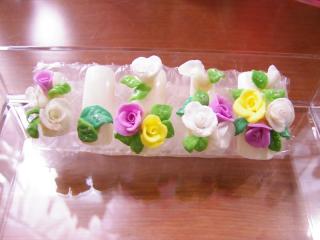 クリア感で、違ったイメージにしました。これも超初期の頃作ったものですが、バラの花びら一枚一枚に厚みを出して、コロンとした感じ、を習った時のものです。実際つけてみると、やはりウェディングドレスよりもカラードレス向きかなー。コロンとさせるのにクリアのカラーパウダーをチョイスした私・・・。これもまた、初心者っぽくて◎です
