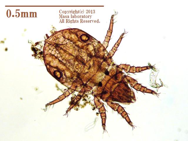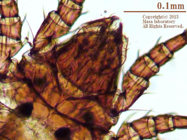 外骨格を持つ生物は、その創意工夫された造形が見ものです。図1 : ミズダニの肢当然ながら、腕を曲げても刺さらないようにトゲが生えています。しかし当然と言いましたが、例えば腕が曲がる方向にトゲが生えているため腕が曲げられない等の、マヌケな方向性に進化する生物もいます。最終的にはそのような生物は絶滅するはずですが、現在も不利ながら頑張って生き残っている生物もいるので、機会がありましたら掲載したいと思います。図2 : ミズダニのカギ爪きゅっと曲がっていて、なかなかのカギ爪ぶりです。このカギ爪にくわえて身体にも刺が生えています。そのため、採集直後は必ず体中がゴミにまみれているので、次のように観察前に綺麗にする必要があります。図3 : ミズダニ 採集直後黒い塊の中にミズダニがいます。ゴミにまみれて幸せそうにモゴモゴしている『まっくろくろすけ』を針でほぐしていきます。顕微鏡は上下左右が逆なので、その作業に慣れるまでこれまで相当数潰しました。合掌。図4 : ちょろ毛いきなり登場しましたが、こいつも鉢受け皿で良く見かける常連です。正式名称が分からないので、ラボでは 『武骨ビューティー・ちょろ毛』 と呼んでいます。そのためか 『ちょろ毛 線虫』 でgoogle画像検索するとトップに出てきますが、その情報によって何かしら不具合が生じても当ラボでは責任は持ちません。 ちょろ毛はなかなか面白いので、次回も解説します。図5 : ミクロの背比べ 『大将! やってる?』ちょろ毛は大きいので、ひょっこりと頭部だけの登場です。----------