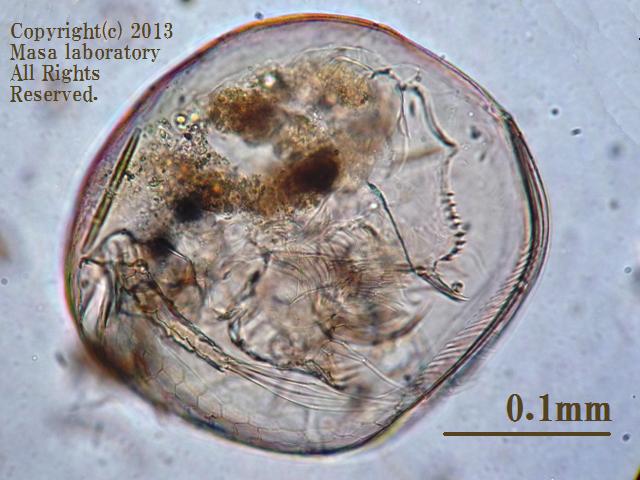 プランクトンは小さいながらも化石になるのですが、その人気度はほぼゼロです。斯く言う自分も、化石は目に見えるサイズのほうが断然見ごたえがあるので好きですが。図1 : ミジンコの仲間ケンミジンコが持っているようなヒゲが確認できるので、ミジンコの類でしょうか。以前も書きましたが今年は撮影機器を改装した為、画質がよりクリアになりました。卵の下部左側に、卵殻を構成している六角形の構造が確認できます。この構造は、このレベルの装置では観察はできないのですが、うまい具合に干渉した為、観察できました。さらりとブログに載せていますが、この写真は『相当なブツ』なので、いつもより長めに鑑賞してほしい一品です。図2 : 単細胞イチジクのような単細胞君です。右側の毛をわしゃわしゃ動かし、左側の漏斗の口でエサを吸い込みます。体中で行儀よく並んで成仏しているケイソウたちがいます。丸い部分は『細胞肛門』という文字通りの肛門です。つまりは細胞に空いた穴であり、不要物を外に吐き出す用途があります。忙しそうに、常にパカパカ開閉をしていました。図3 : ミクロの線路記号アオミドロは細長い細胞が連結した多細胞生物なので、このような中抜けもたまにあります。----------