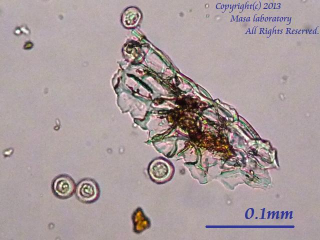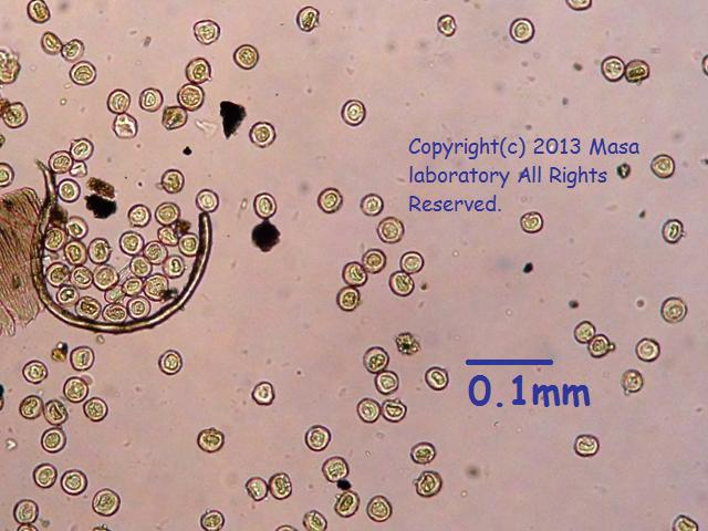 この観察は本来は杉花粉を見る為ではなく、愚利公さんから寄せられた『バケツに発生するミジンコの由来』 を調べる為に行ったものです。バケツに発生するミジンコは、バケツに土が混入していないならばミジンコの発生源は、『ミジンコの耐久卵の飛来』 しかないと考えました。探せばその記事や論文はあるのかもしれませんが、自分の目で確かめたくなったのです。しかし、時期があまりに悪すぎました。自分は花粉症ではないので、杉花粉の事をすっかり失念していたのです。かくして花粉の大運動会と化した観察に、すっかり初心を忘れたのでした。・・・というわけでもないのですが、結果的にはミジンコの卵は見つかりませんでした。時期も場所も良くなかったので、また時期を改めて観察します。図1 : ミクロの玉入れ図2 : 繊維にくっつく花粉たち帰宅したら、掃除機で花粉を吸い取るのは大切です。花粉はダニの好物でもあるからです。図3 : いつも古紙の回収にご協力ありがとうございます青い染料が残っているので、おそらく印刷物の繊維です。ミステリーならばこのサンプルから話が進展するのでしょうが・・・今日もMASAラボは平和です。----------