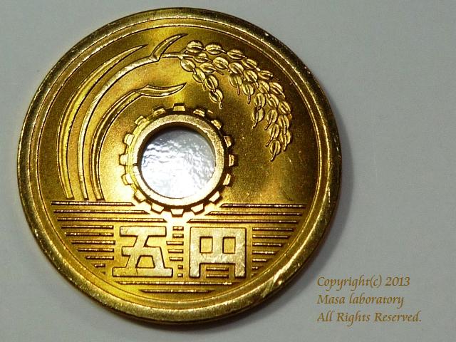 前回紹介した 『歯車』 の正体は、図1でした。図1 : 五円玉 (平成元年)財布にあったら、賽銭箱に真っ先に放り投げられる宿命の 『5円玉』です。お賽銭を手に持ち、賽銭箱に財布を投げた友達がいましたが、それはまた別の話。五円玉は良いデザインです。上半分に稲穂、中心に歯車、下半分に水面が装飾されており、それぞれ農業、工業、水産業を意味しているそうです。デザインに力を入れすぎてスペースがなくなった。・・・かどうかは知りませんが、5円玉だけアラビア数字で金額が表示されていません。 何故なのでしょうか。再掲図 : 五円玉歯と歯の間に削った溝が確認できることから、歯車は圧印ではなく削って作られていることがわかります。なんという巧みな匠の技でしょうか。この刻みに感嘆して、図を載せたのです。----------ついでに、最近見つけた発見を載せます。図2 : 10円玉 平等院鳳凰堂10円玉の平等院鳳凰堂です。その左右にある楼閣を覗いていて、あることに気が付きました。図3 : 平等院の左の楼閣図4 : 平等院の右の楼閣図3と図4を比べて分かるように、平等院の右の楼閣にだけ、0.1ミリメートル程度の穴が開いていることに気が付きました。他の何枚かを覗いても、右にだけ穴がありました。そうなると、ある疑問がわいてきます。 『この穴は全ての10円玉にあるのか』それを調べる為に、年代を徐々に古くして覗いてみました。予想通り、平成シリーズには全て穴が開いていました。図5 : 10円玉(昭和64年)摩耗したことで逆に穴がよく観察できます。どんどん年代がさかのぼり、縁に刻み目がある通称 『ギザ十』 と呼ばれる年代に突入しました。図6 : 10円玉(昭和30年)とんでもなく摩耗していますが、穴は確認できます。結果的に、平等院モデルが発行された昭和26年まで覗きましたが、全てに穴が開いていました。偽造防止かどうかは知りませんが、この穴は最初から決められていたデザインのようです。----------【気になる話】図6 : 10円玉 平等院基部個人的に非常に気になっているのが、図6です。10円玉の平等院の基礎は 『亀甲積み』 の石垣になっています。以前に拝観したときは、コンクリート打ちっぱなしだったような気がします。平等院鳳凰堂は現在修復中ですが、はたして石垣も作るのでしょうか。----------【おまけ話】現在流通している硬貨は、1円、5円、10円、50円、100円、500円です。この中で、年号の表記が、 平成十五年 という 『漢数字』 ではなく、 平成15年 という 『アラビア数字』 で表現されている硬貨が2種類あります。さて、どれでしょうか。解答は財布の中にあります。----------