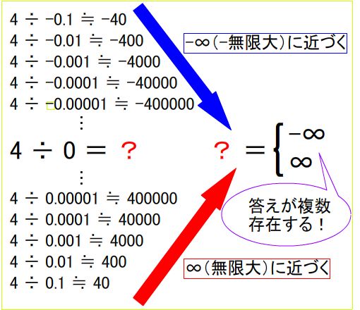 すると、ゼロで割り算すると答えが、『マイナス無限大』 と 『無限大』 の二つ出てきます。