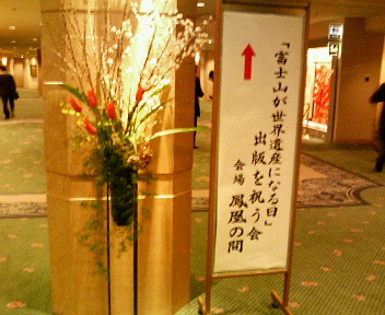 今日は2月23日。フジサンの日。招待されていたタイトルの会に思い切って東京まで行った。というのも、この会の発起人は本当にそうそうたるメンバー。そういう場にいくチャンスもそうそうない。と3時の東京発飛行機にギリギリ間に合いセーフ!会場は明治記念館。 ここの住所は2-2-23!フジサンです。そして今日の参加者は223人らしい。恐ろしい数字です。来られているメンバーも中曽根元首相(富士山を世界遺産にする国民会議の会長です)は、はじめて目の前で見ました。カシャ 他、横浜マリノスの岡田監督あなたは絶対運がいいの浅見帆帆子さん国会議員の面々もうすごすぎる方々今回の出版の著者であり、会の委員長でもある小田全宏氏(今回招待いただけた方です)を含め、共通して、ほーんとうにみなさんスピーチが上手!!演出も最高笑いもちゃんとはいります。ぜんぜん聞いていてもつまらなくないです。使う言葉がいい。きれいです。(上品という意味ではありません。)ちなみに富士山に関するいろんな話、すばらしい写真も見ることができました。日本人なら富士山を嫌いという人はいないのでは?富士山の見えるところでは、ワイングラスに富士山をかざしてから飲むと本当においしくなるらしいですね。また、富士山が見えるところに住んでいる方の健康保険の使う頻度は少ないとか・・・富士山そのものに良い波動がでているんだな。なんて感じました。単に世界遺産になるだけでなく(新聞を見て「あ、富士山が世界遺産になったんだ」というのでなく)国民みんなが忘れかけていた良き日本を思い、運動できるひとつのきっかけとなれば・・というとても高いミッションです。昨日のアットホームな場も大好きですが、こういった波動の高い場というのも、なんか心の栄養素をいただけたようでとてもよかったです。