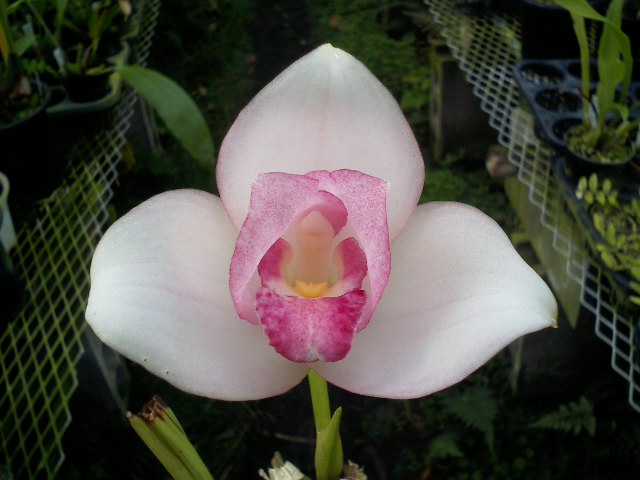 イオノプシス属の原種、ウトリキュラリオイデスです。フロリダからボリビア、パラグアイにかけての着生ランです。昨日会長からの電話で岩手に出品したアダとガストルキスが共にブルーリボン賞(お立ち台)になったと連絡ありました。皆様のお陰ですm(_ _)m。今日はLOVEmimiさんが行ってるようです。