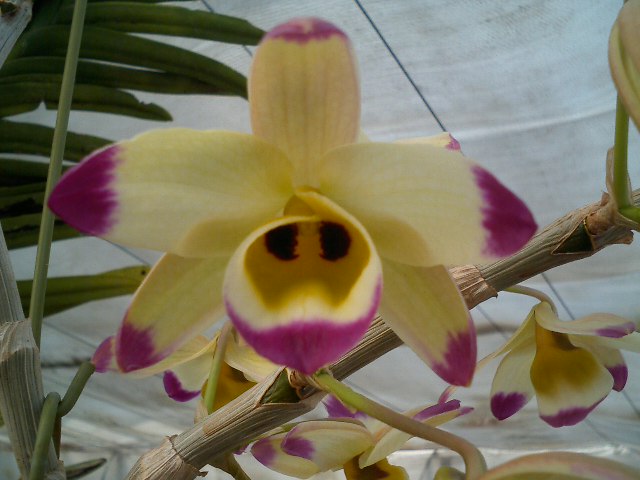 デンドロビューム属の交配種シー・マリー‘ハルカゼ’です。ドームの撤収作業に行ってくださった月花さん達が山本さんから会員にといただいたデンドロ、花が終わりかけていますが付きが良さそうなので新芽を大きく育てようと思います。