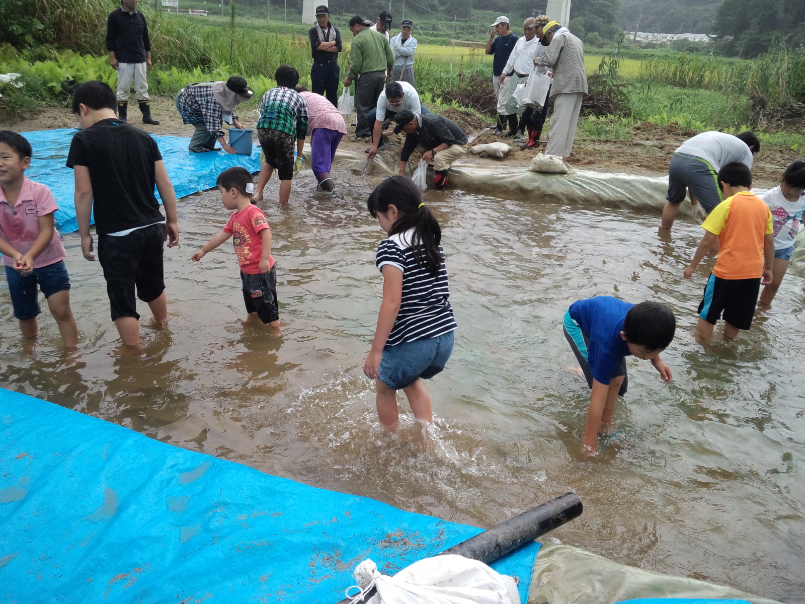 放してつかみ取り大会、水をだんだん減らして魚が