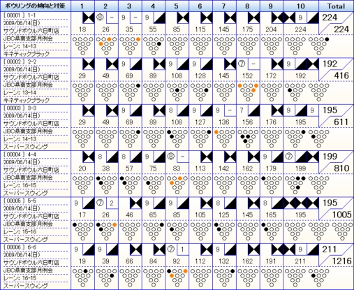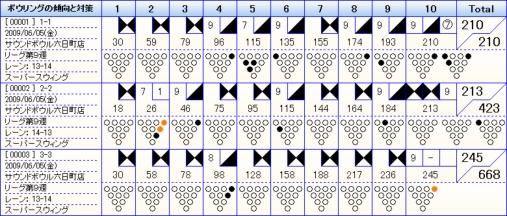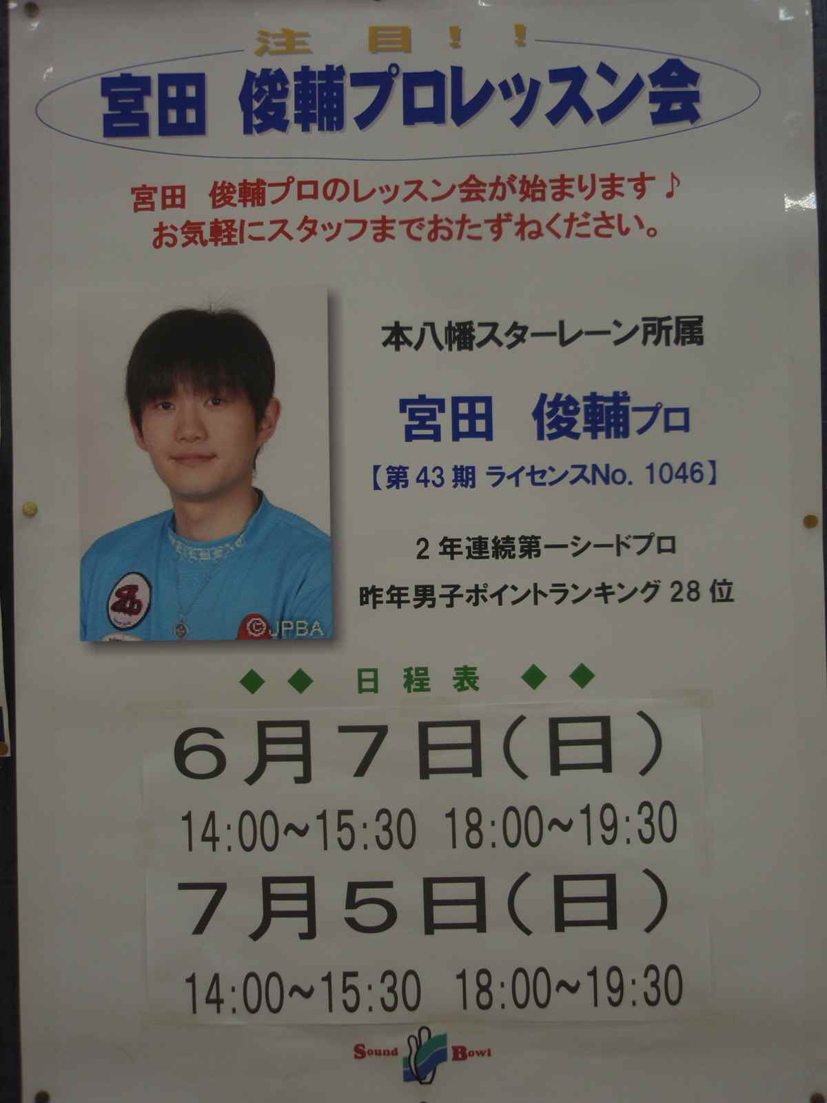 6月7日は朝からJBCの新潟県2人チーム選手権大会に参加。大会が終わってからサウンドボウル六日町店へ。その日は本八幡スターレーンから宮田俊輔プロがレッスン会のため初来場。私はレッスン会に参加せず見学。理由は、私が基本からかけ離れたスタイルのため、指導する側も受ける側も困惑するのでは?って思ったからです。だってこんなですよ。 1)アプローチに立った時にピンを見る(狙いを定める) 2)4歩助走なのにプッシュアウェイは2歩目から。 3)2歩目の左足はスライド(タイミング合わせ) 4)4歩目(フィニッシュ)の右足つま先はコンコンコンと3回引きづる(重要) 5)スパットを見ずピンを見ながら投球(何枚目を通っているか分からない)1)~4)はレッスンに影響ないと思いますが、5)はレッスンでは致命的でしょ!『何枚目を通していますか?』って聞かれても『わかりません』って事になりますからね(笑)でもレッスンを見学し、宮田プロって分かり易い指導やその人にあったアドバスをするので私も参加したくなりました。参加した人にも大好評でしたよ。第1シードの男子プロからのレッスンを受けられるチャンスってなかなかないですしね。皆さんも是非参加してみて下さい。次回のレッスン会は、7月5日になります。レッスン会が終わり、ビールチャレンジ(従業員チャレンジ)に参加。ここで急遽、宮田プロが参加する事となり2G目に宮田プロに勝ったら通常ビール2本に対し4本貰える事に。そして私は宮田プロと同じボックス。1G目 最近得意の7ピンカバーミスとスプリットで2オープン。 宮田プロはかる~く240オーバー。2G目 1G目同様に10ピンカバーミスとスプリットで2オープン。 宮田プロは1G目の7フレから13連続も7フレパカーンでオープンも またしても簡単に250オーバー。3G目 両端1回ずつカバーミスで2オープン。 宮田プロはレンコンの変化にちょっと苦戦し2オープン それでも簡単にプラスしちゃいます。4G目 最終ゲームもノーミスゲームできず1オープン。 宮田プロは最後ゲームも240オーバーで締めくくり。AVE:209.3それに対し宮田プロのアベは240オーバー。ビールチャレンジの勝敗は3勝1敗でビール8本Get。だけど宮田プロに1勝も出来ず悔しさが残りました。って事で、次の日練習に。AVE:223.4ん~微妙。