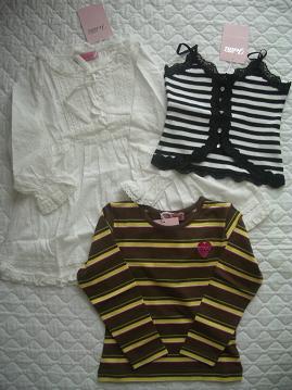 90cm在庫ありま~す買い逃した方、急いでくださいね♪昨日不在だったので今日届きました~まずは1個目ネタバレ★☆★ レースワンピースボーダーキャミボーダーロンTワッペンの4点でした~ワンピは好みで無いので交換希望です。jenniのデニム系との交換希望です。サイズは90~100cmでお願いします。また時間を見つけてUP画像と2個目もしますので、覗きに来てね