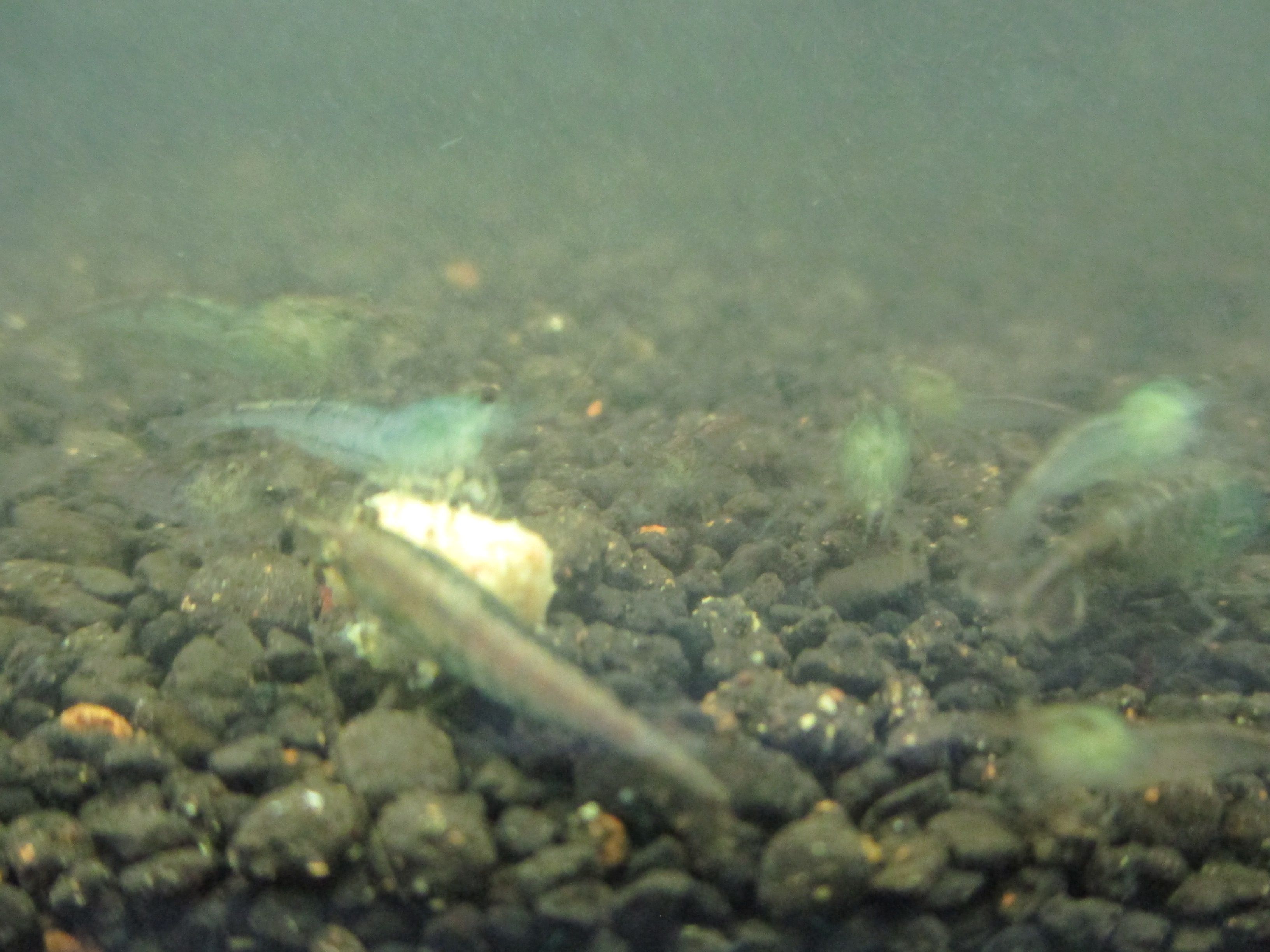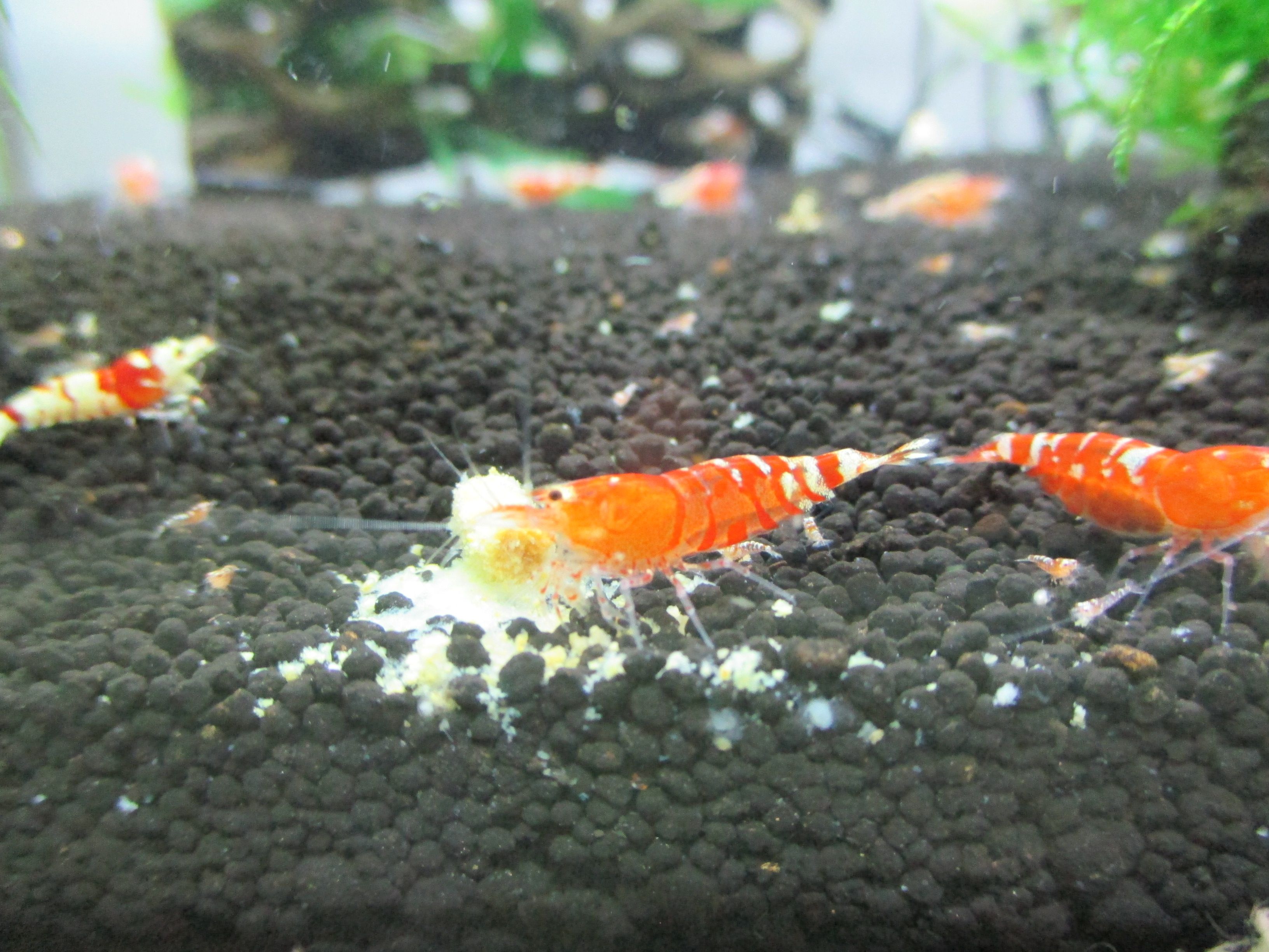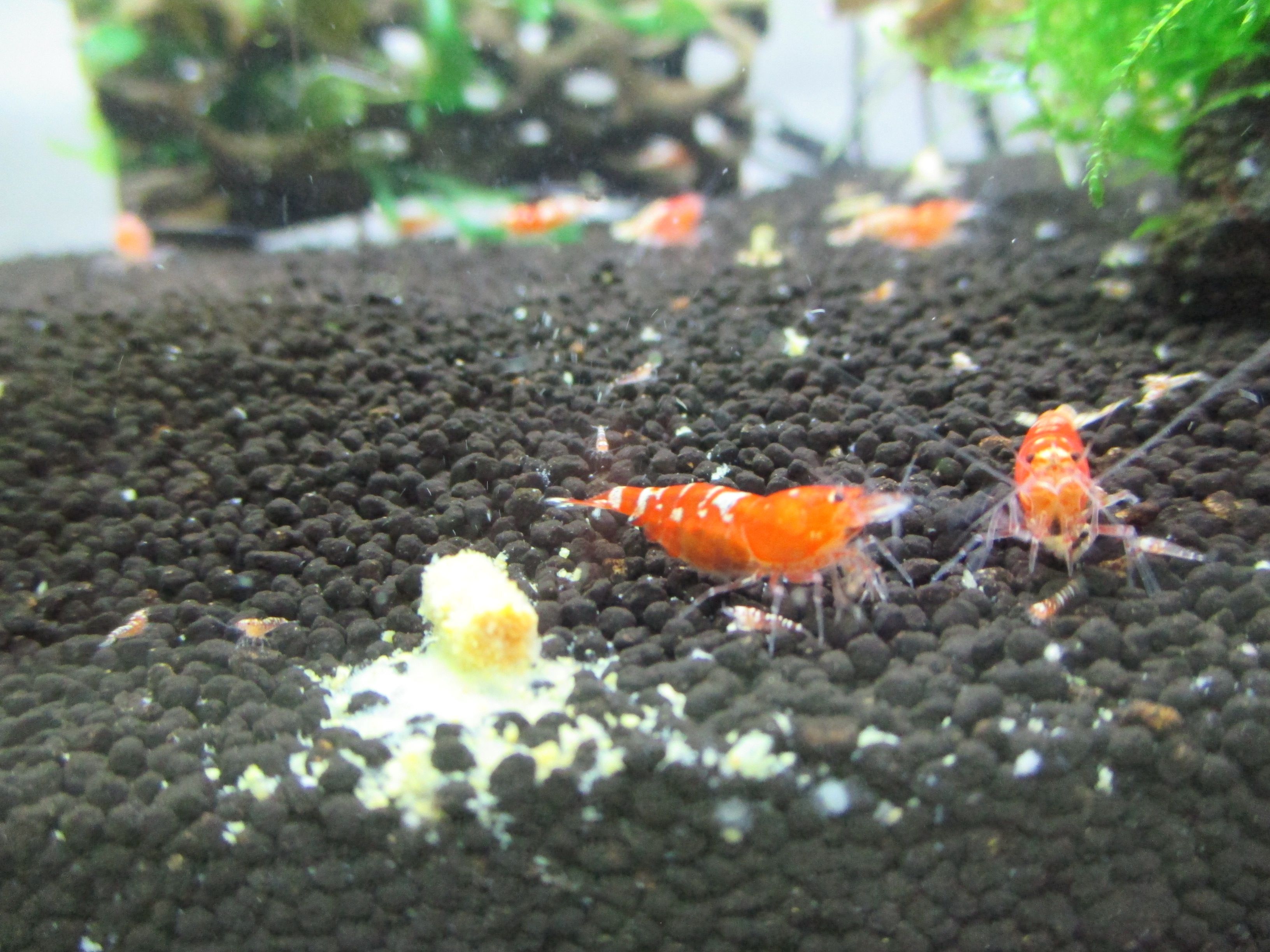 エビ水槽、少し足し水を実施して夕食には食い付きの良い「THE EARTHフード」を投入すると、レッドビー達はすぐに寄って来てツマツマしている。