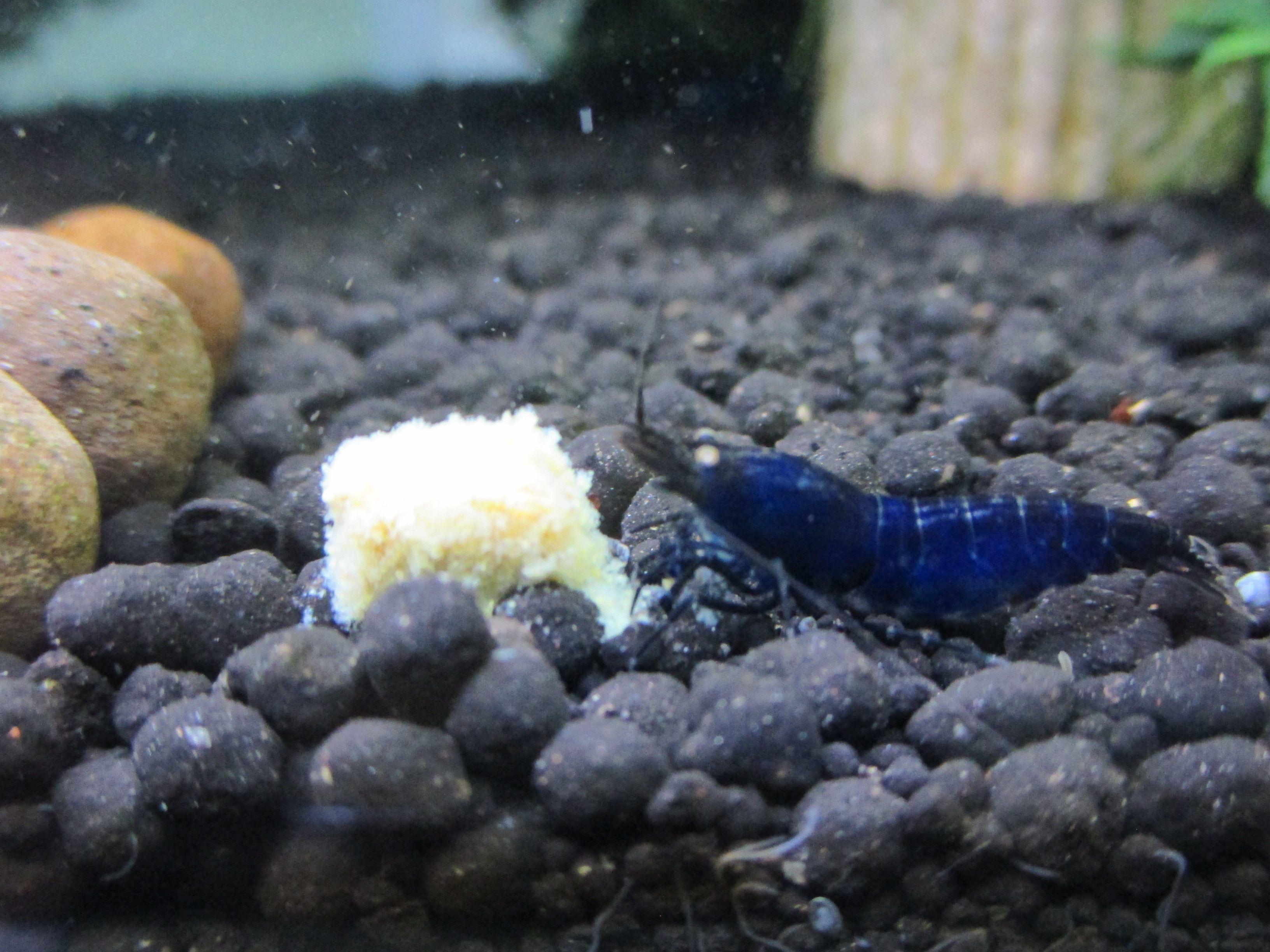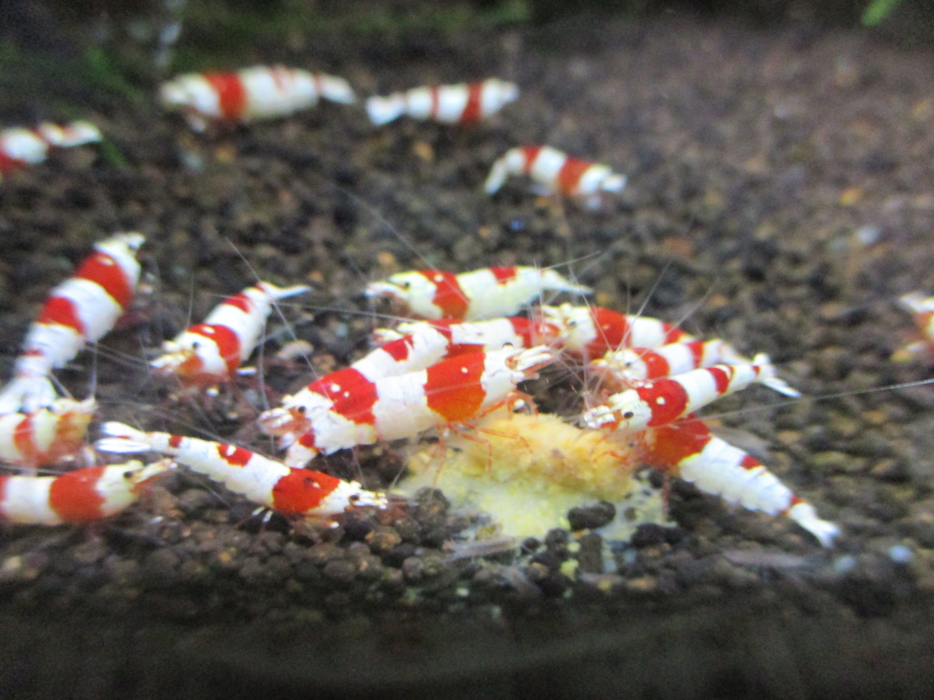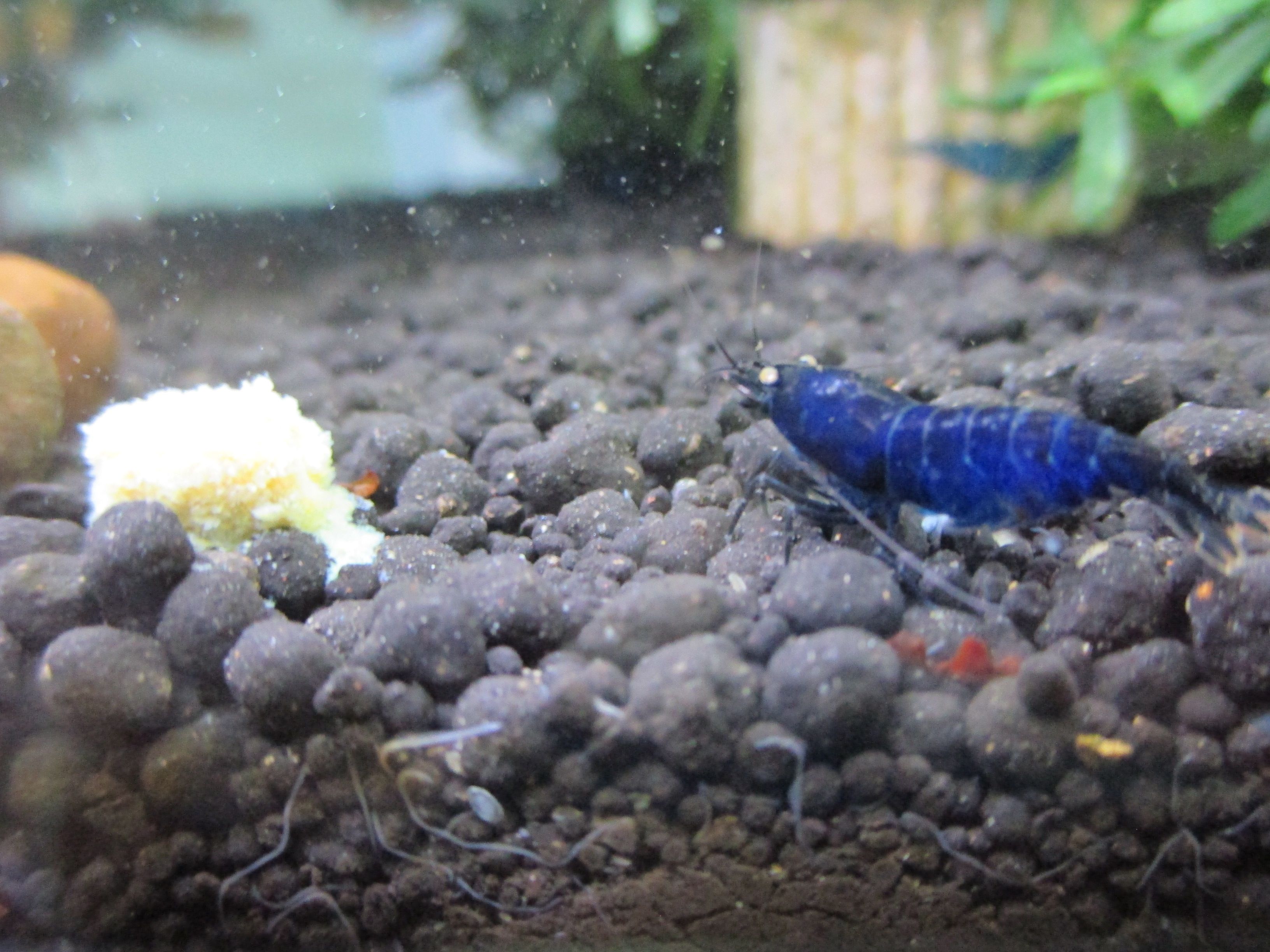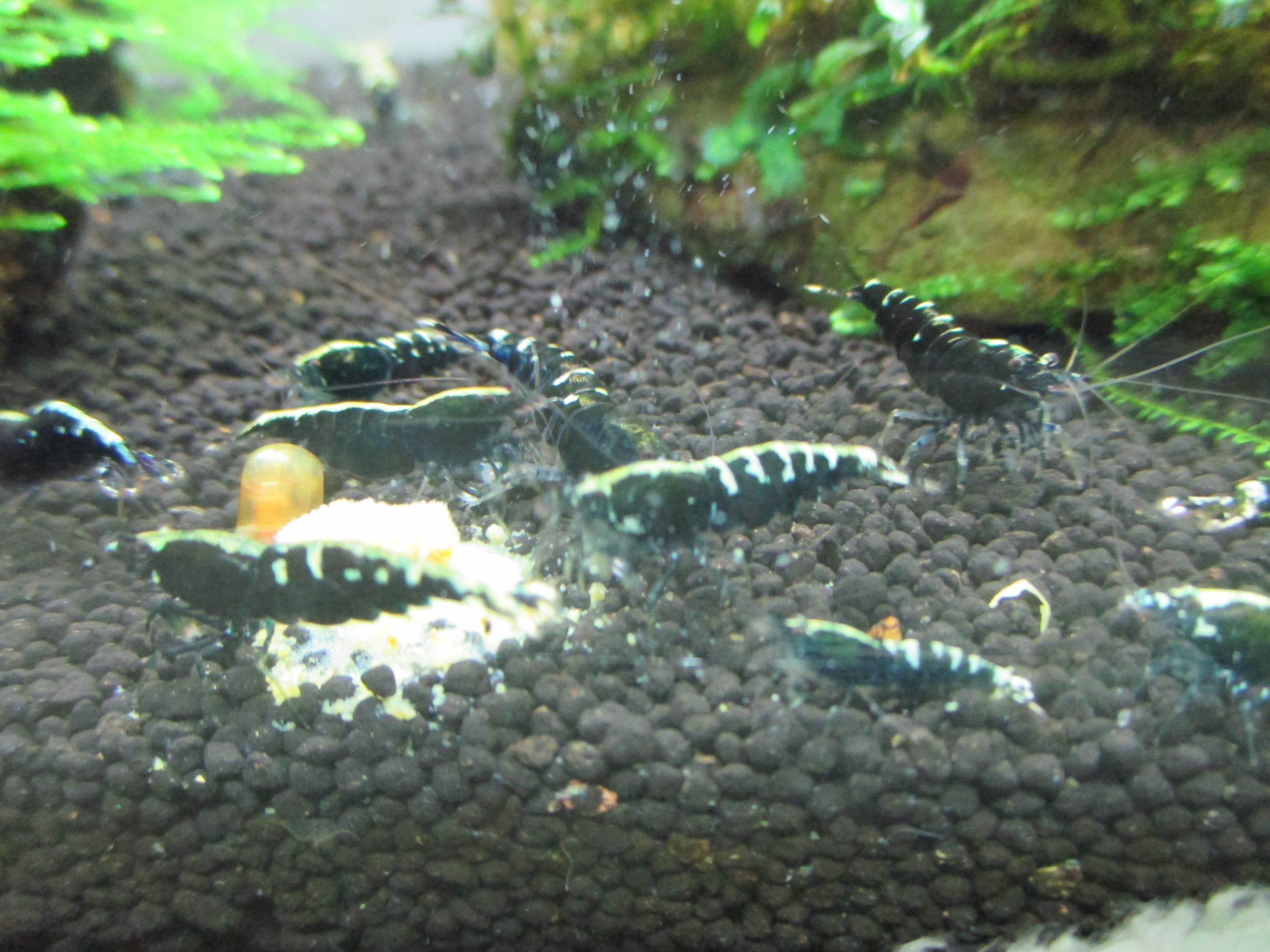 エビ水槽、少し足し水を実施して夕食には食い付きの良い「THE EARTHフード」を投入すると、レッドビー達はすぐに寄って来てツマツマしている。