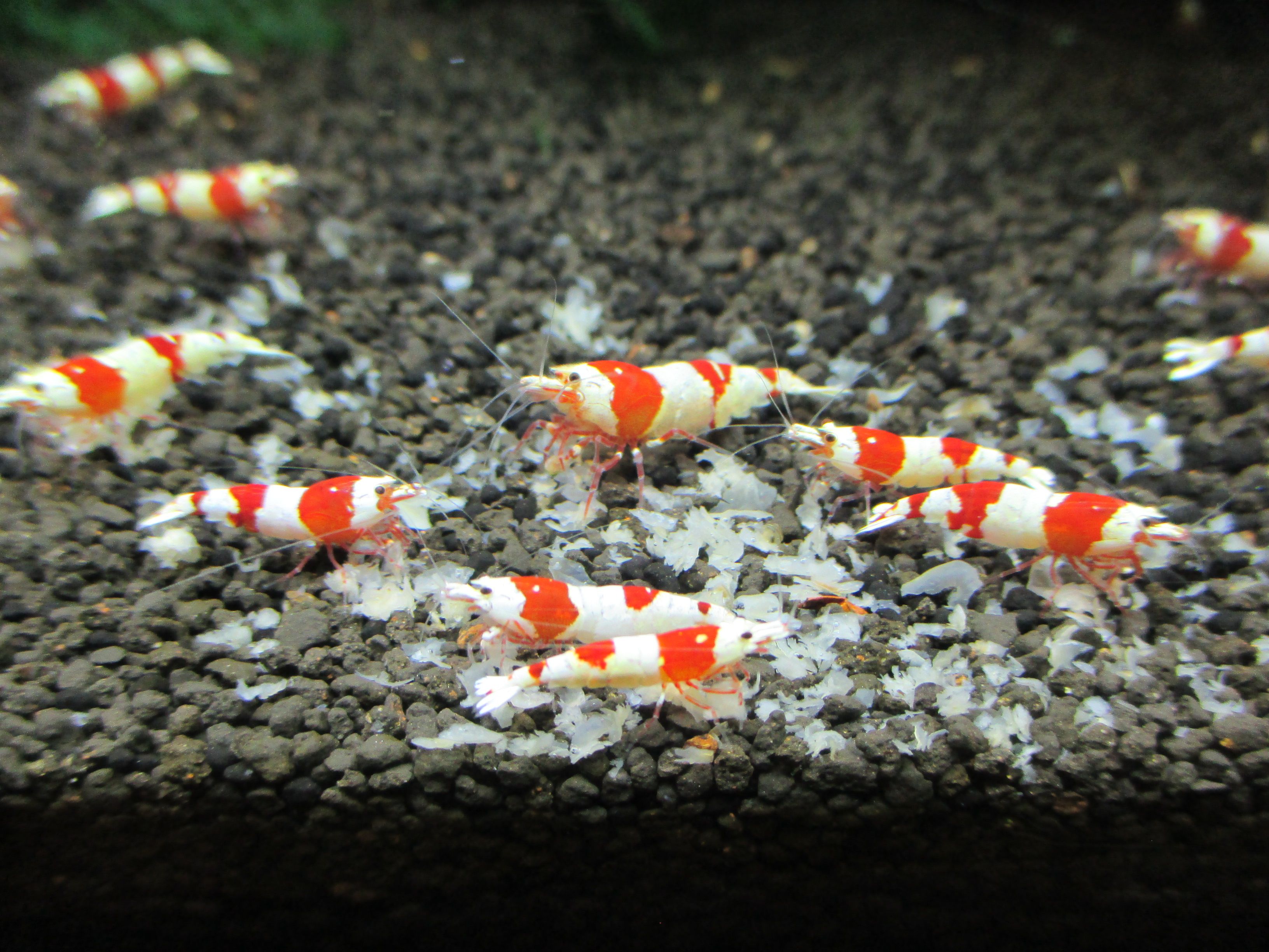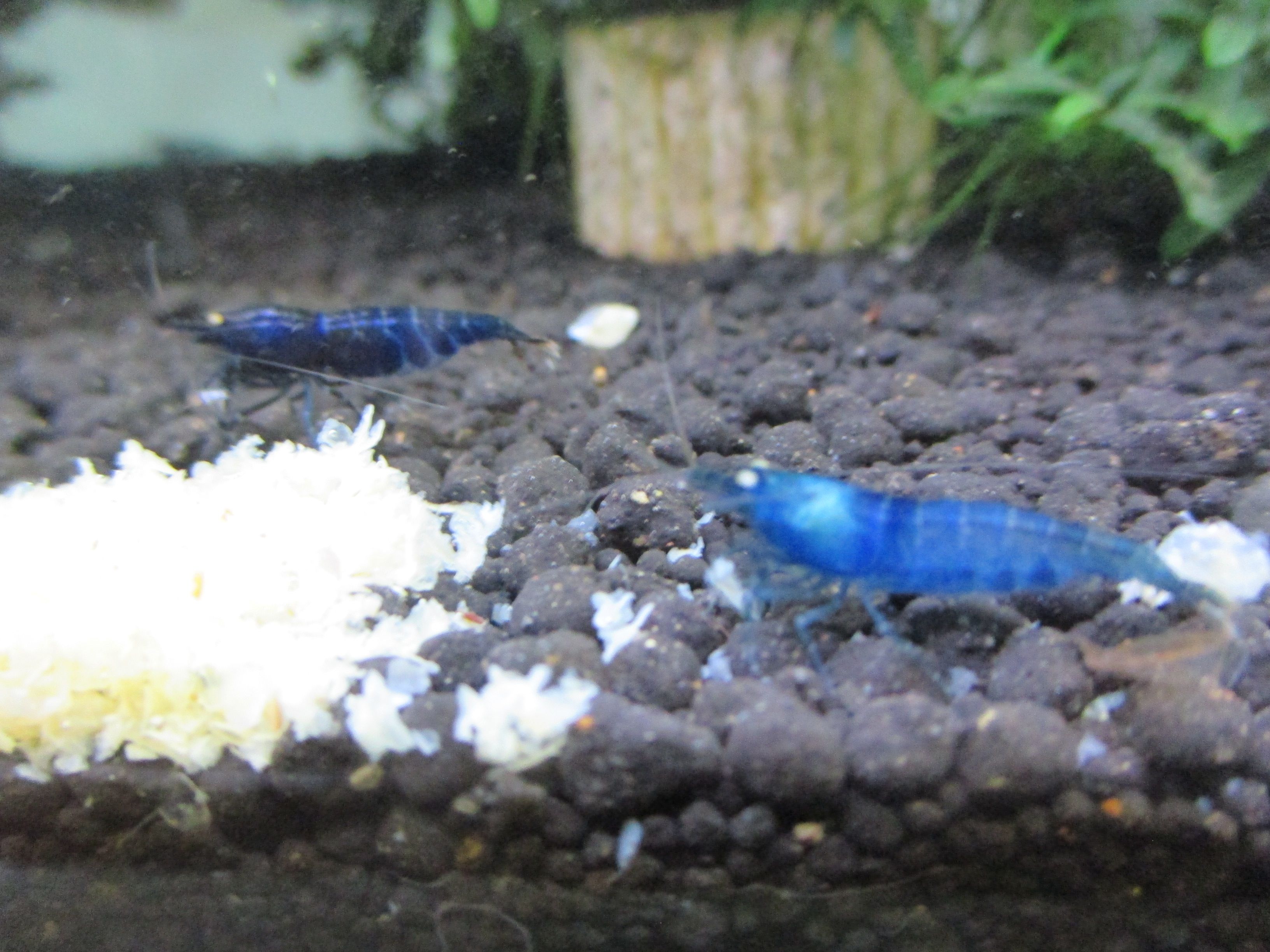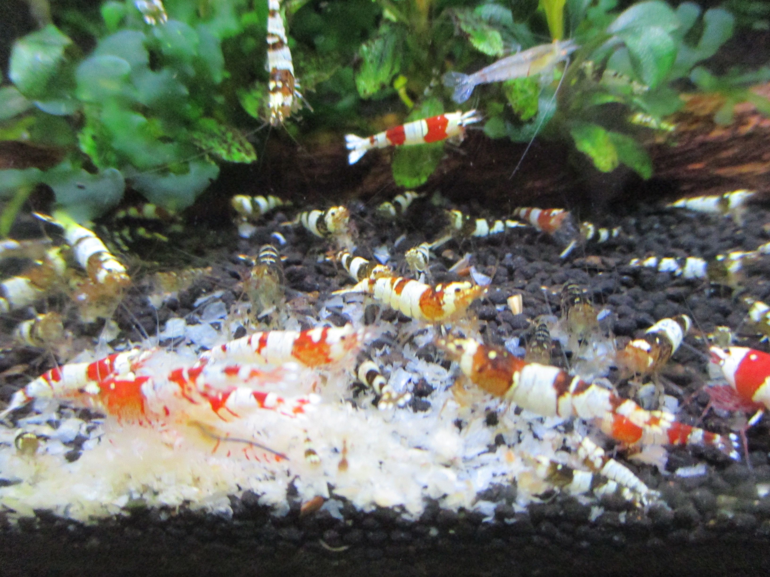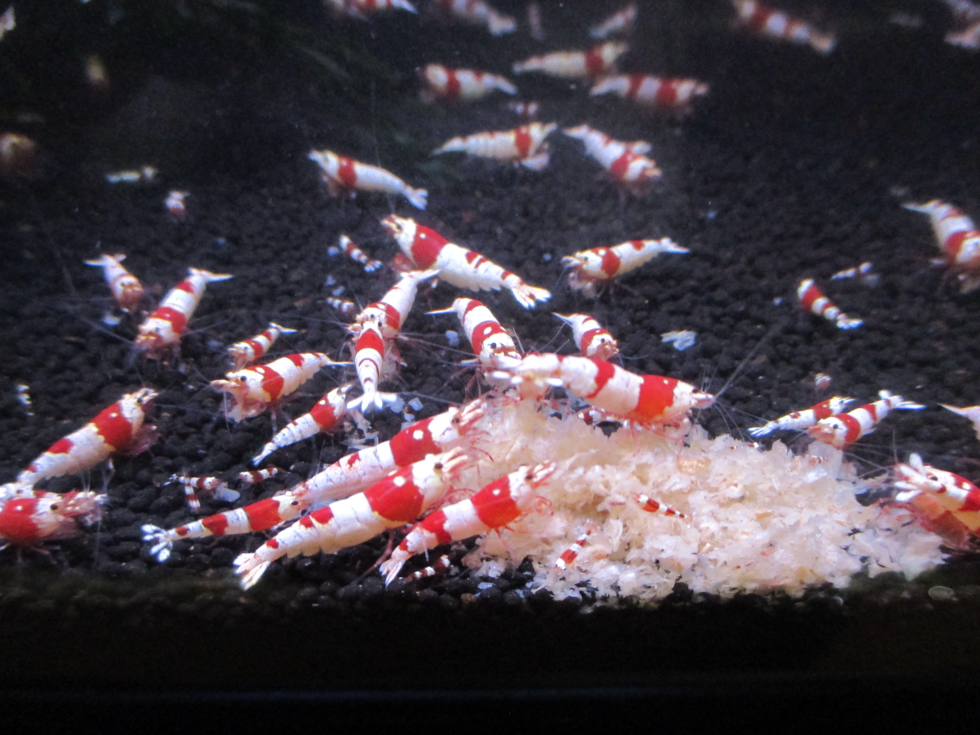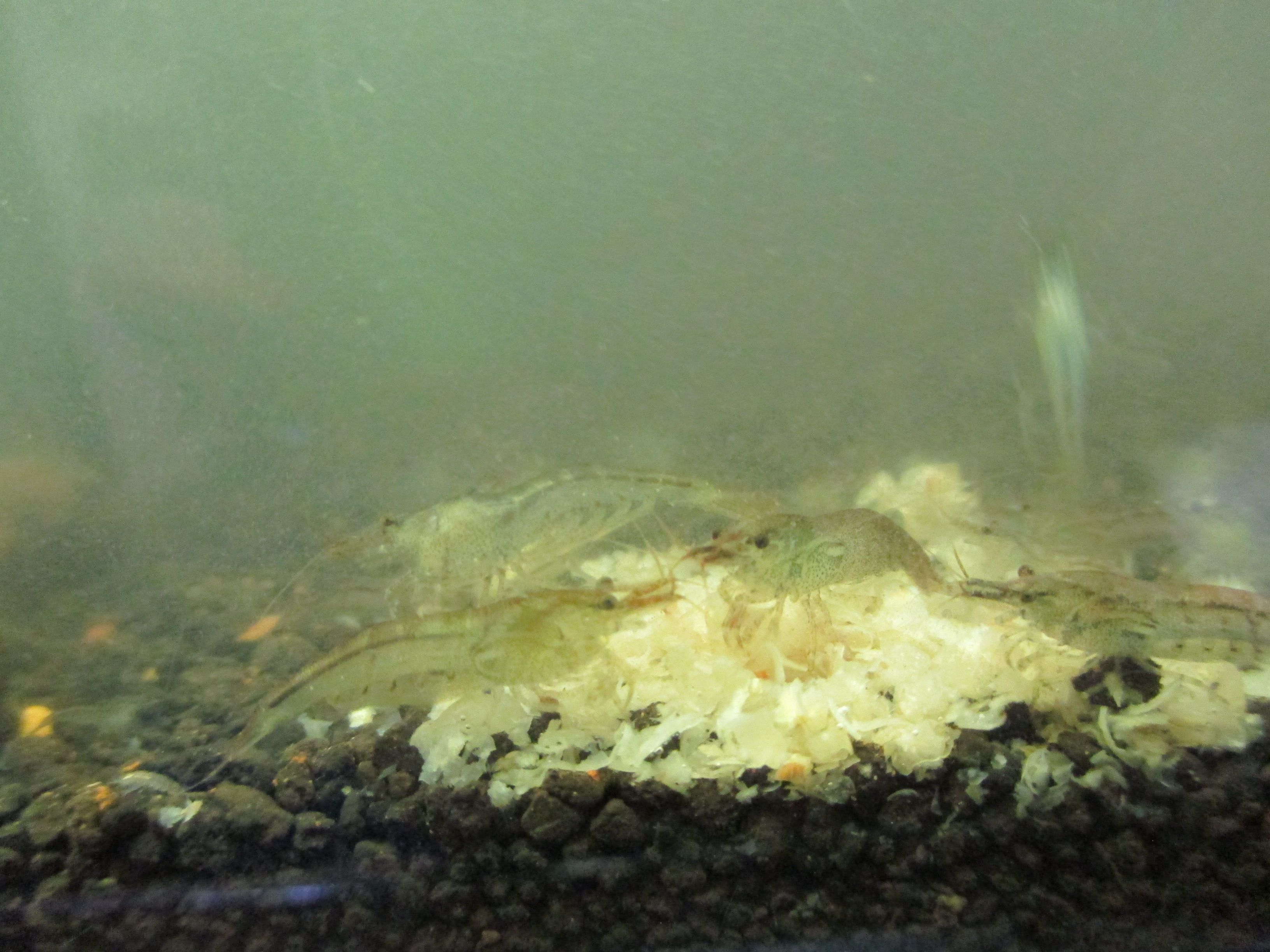 エビ水槽、夕食には落とすとすぐにバラける「腐らない餌」を与えた。バラけたものに稚エビも寄って来てツマツマしている。