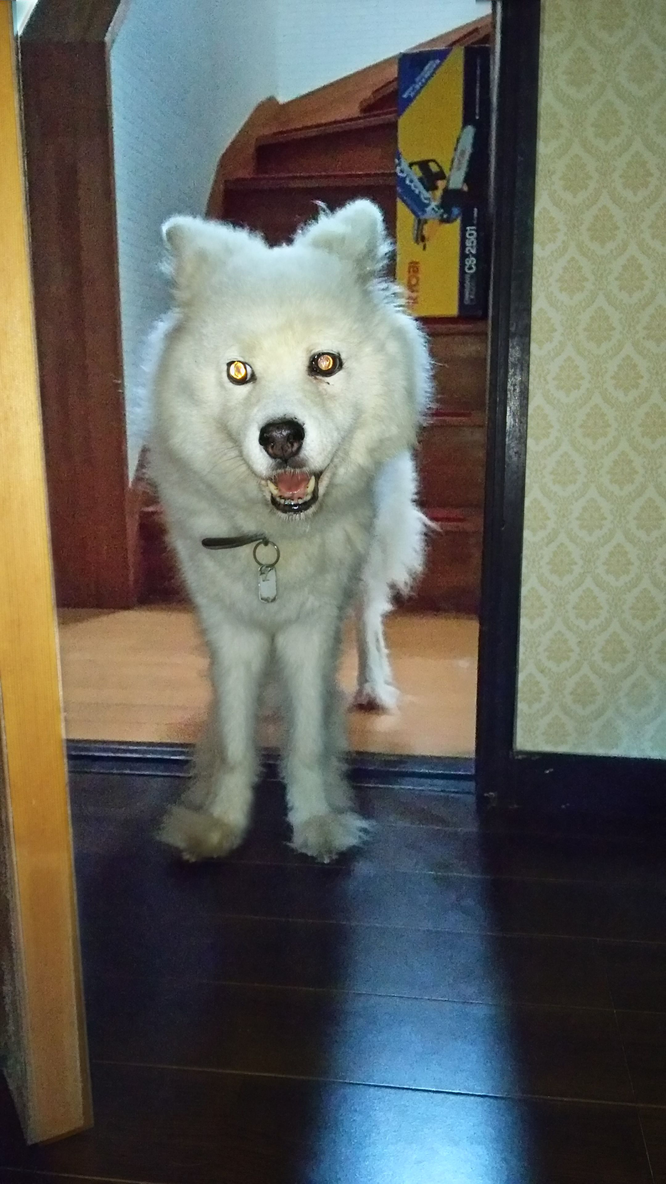 8月10日夜、海辺の家に出発、日付が変わる前に着いて、それから14日に帰って来る迄、元気に海で遊んできました。あいにく雨が多かったので屋内撮影ですが、写真は8月12日のものです。暗い所ではこんな風に目が光るカティです。