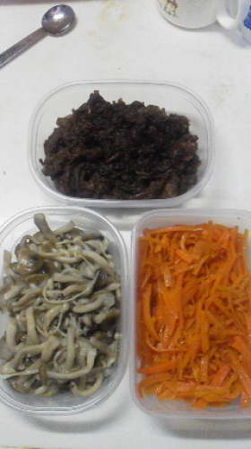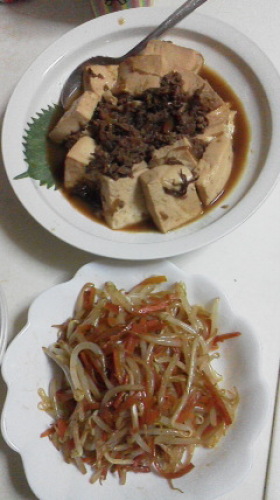ストックおかずの牛こまのしょうが焼きと豆腐1丁使って、パパッと肉豆腐が完成。次ににんじんのナムルを使って、もやしと炒め合わせると一品、炒め物が出来た。。。意外にストックおかずって便利かも。。今日はこれで職場に持っていくお弁当を作れたし、夕飯も早く作れて、嬉しいなあ。。「ご飯出来たよ~~」とキッチンから声をかけたら子ども達は「え?もう?」とビックリ。。「お腹空いた~~」の大合唱には勝てない私。。疲れててもパパッとご飯の支度が出来るから私のつよ~~い味方!!
