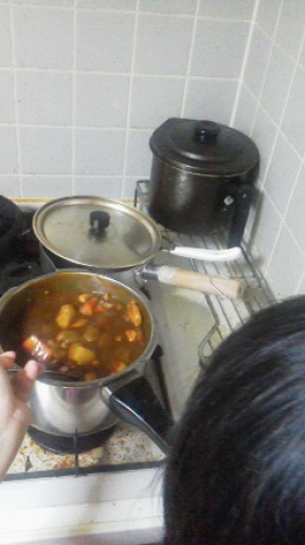 何度も挑戦して、2回目、自分でカレーを作ったねぇね。。最初は皮を剥いている時にピーラーでひっかけて断念。次は野菜を切ってる時に誤って指を切り、大泣きでリタイア。やっと3回目でパパに教えてもらってカレーを何とか完成させ、今日はどうにかこうにか、自分で野菜や肉を切って炒め、煮込んでアクを取り、よく煮込んでルーを入れてまぜまぜ。。何とかカレー作りは形になった気がする。。。作ってる様子を写真に撮って、盛り付けたカレーの写真もしっかり撮る!!ごろごろ野菜の入ったカレーの出来上がり!!ご飯が少々硬かったけど、カレーの方は美味しかったから。。。ちゃんとノートに感想と写真を添えてあげなくちゃ。。頑張ったね^^