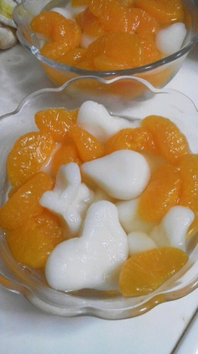 みかん缶とだんご粉を使ってフルーツポンチ風の冷たいおやつを作りました。子ども達は笑顔でやる気、まんまん!!こねただんご粉を星、しずく、ハート、げんこつみたいな形、それぞれ形を作ってもらったら、沸騰したお湯の中へ。。。 浮き上がったのをボールにいれた氷水の中へガンガン入れて冷やし、冷蔵庫に入れた冷えたみかん缶を開けて器に盛り、だんごと缶のシロップを入れて完成!!だんごに味がないのでジュースで練っても良かったかも。。。反省。 うちのおばあちゃんが夏になると作ってくれた白玉の入ったフルーツポンチ、それをみかん缶だけで作ってみた。今度は他の果物やゼリーを入れてもっとおいしくしてみよう。。後は子ども達の喜ぶ顔があれば、私は幸せ!!