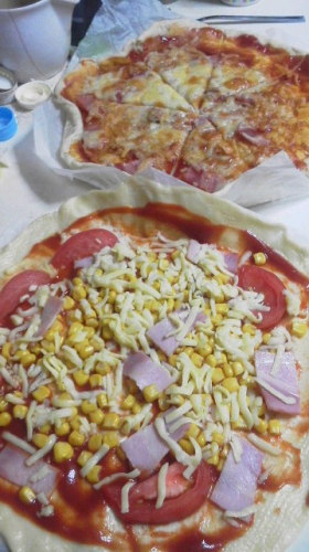 おやつに作るつもりが、夕飯になってしまった。。。生地作りはねぇねと材料を計り、混ぜて、大きなフリーザーバッグに入れて冷蔵庫へ。袋3つ分、1時間冷蔵庫で寝かせ、打ち粉をしてこねこねしたら、丸く薄く延ばして6枚の生地を作った。トッピングはトマト、ベーコン、コーン、ツナ、 マヨネーズもどき、チーズ。トッピングの盛り付けはねぇねとゆづに手伝ってもらい、オーブンを余熱してスタンバイ。余熱しおえたオーブンが鳴ったら、ピザを入れて焼くだけ。6枚はさすがに多かったので、次は4枚に。。。今度はゆでたまごとか、ポテサラの残りとか、ウィンナーもトッピングにしてみよう。