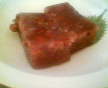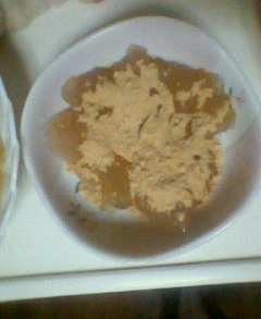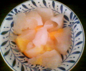 小学生のねぇねはいつも「お腹すいた~~」が口癖でこの日も「お腹すいた~~おやつ~~」の大合唱。。。。休みで家にいたので作る事に。。。何かないかとキッチンの引き出しをあけて探すとゼラチン、寒天パウダー、フルーツ缶を発見。。。。冷蔵庫にはカルピスもどきとジュース。ゼラチンは固まるのに時間がかかるので寒天を使ってゼリーを作る事に。。。水400mlを鍋に入れ、寒天パウダーをさらさらっと。火にかけて煮溶かし、2分ほど沸騰させ火を止めて、アツアツのうちに50gの砂糖を入れて溶かし、それにカルピスもどきをいれ、混ぜ混ぜ。。。アルミのボウルに缶汁を切ったフルーツをペタペタつけて鍋の寒天液をボウルに流し込む。後は鍋にはった氷に塩を入れ、アツアツの寒天液のボウルをそこで冷やしてしばし、あら熱を取ってから冷蔵庫にイン!これは固まった寒天ゼリーをくずしてお皿に盛りつけたんでぐちゃぐちゃですが。。。。ちょっと硬めの寒天だったのでねぇねには不評。。。もう少しプルプル柔らかいのがいいと注文がついたのでリベンジしなきゃねえ(笑)