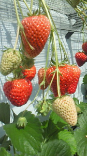 いちごちゃん達です↑おいしそうでしょ!!春休みにおばあちゃんちに行きたいと言う長女の希望と次女の預け先を考えた末に1週間ほど、私の実家へ預ける事にしました。 実家に帰るなり、妹から翌日、いちご狩りに行くよと言われ、 翌日、近くに住むいとこ達と私の家族、子ども達の大人数で 隣県の果樹園へいちご狩りに出かけました。 高速からかなり山手に入り込んだ道を入って、 看板の示す矢印どおり進み、果樹園へ到着。 料金を払い、果樹園の人から諸注意を受け、それから 各々、ハサミを手に赤く熟れたいちごを摘みました。 取立てのいちごは甘くておいしい!! 長女はハサミを手に嬉しそうにいちごを摘んでは口に放り込み、 次女はじいちゃんが摘んだ大きないちごを ムシャムシャ食べては次をねだるの繰り返し いとこ達もいちごを食べながら、うちの子ども達の 相手をしてくれたりして、楽しそうな雰囲気。 可愛い盛りの次女はみんなのアイドル状態。。。。 口の周りをいちごでまっかっかにしながらニコニコ笑っている。 ここは4種類のいちごを栽培。 いちごの棚は低めに設置されていて、小さい子どもでも いちごを手に取って見られるくらいだった。 家族連れで賑わい、園内で摘んで食べ放題は30分。 急いで食べたけど、またみんなでいちご狩りに行きたいな。。。 子ども達も喜んで行くから、近くで行ける場所を探して 家族で行ってもいいかもしれない。。。 子どもの笑顔を見ると、私も嬉しいから。。。