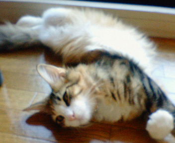 ↑一見矛盾してるようで、全く矛盾しておりません。(私に限り?またとんと日があいてしまいました。なんで日課にできないんでしょう?今は机にかじりついているところです。で、ふとブログを思い出しまして、気分転換です。知る人がみれば、こんなときに気分転換なんざいい度胸だ、といったところでしょう。 最近雨多いですね。雨の日で引きこもって何かするのだいすきなんです。今日はあいにく降ってませんけど、空色が悪いのでまぁまぁいいです。もう夜か・・・。こないだ姫路に久々にいってきました。たいした用事ではなかったんですけどね。久しぶりに乗る新快速は恐ろしいほどのスピードで。ついつい一番後ろの車両にのってしまいました。しかも今、新快速、敦賀まで行ってるんですね!!恐ろしく長い・・・。そして恐ろしく混み合っているという恐怖の電車です。関西に来た際はぜひ姫路まで新快速をご堪能あれ☆今月末にわがやの裕子が避妊手術をします。と、いうことは女の子だったんです。おなかにあった垂れた部分は例のモノではなく、「脂肪」だということで、ただの太りすぎです。6ヶ月でもう4キロありますから^^;種類もはっきりしました!ノルウェージャンフォレストキャットという猫でございます。運動神経はいいとありましたが、残念ながらその例に大きく漏れ、兄弟みなそろって運動神経は鈍いようです。50センチの飛び移りも失敗し、角でおなかをぶつけていたほどです。多分食っちゃ寝してるからだと思いますあぁ~裕子が一匹で1泊も病院で過ごすなんて今から不安で不安でしかたありません。お泊りで朝帰りだなんてっっ