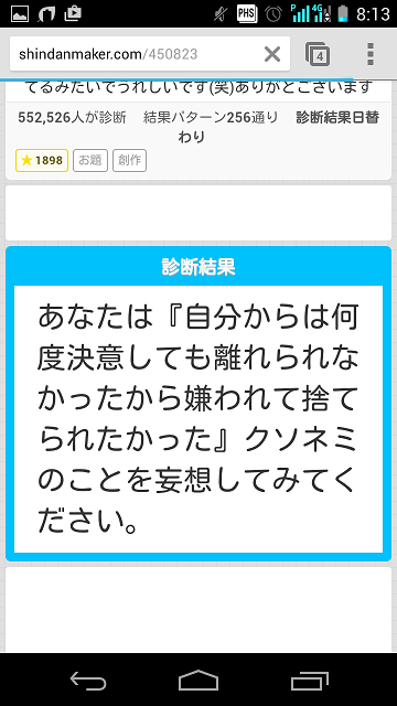 お借りしました。01 あなたのHNを教えてください。またそのHN由来は? 長押つのりと申します。 好きなもののアナグラムです。02 自己紹介を。 ネットの片隅でひっそりと二次創作をしております。03 あなたのHPのタイトルは? 「Laub」04 そのHP名の由来、参考にしたものなどあれば教えてください。 前のHP名を外国語に変えました。05 あなたのHPのジャンルは? 主に感想と二次創作と一次創作です。06 あなたのサイトのURLを教えてください。 https://plaza.rakuten.co.jp/nanayukitp/07 あなたのHPのコンテンツの羅列をお願いします。 小説、漫画、アニメ、映画、テレビの感想 イメソン、カップやきそば、似たジャンル話、大喜利、link 二次創作/特に7種、少プリ、復活、俺ティー、たまに松、狂気、APH、HTF 小説9割、絵1割 一次創作/特に恋愛もの、メリバもの たまにプログラミング 園芸、工芸、料理、旅行してる日常08 あなたのHPの見所、力を注いでいる所はどこですか? 創作で遠慮せずぶっこんでいくことです。 結果場末の酒場みたいになってます。09 自分のHPの完成度は100%中何%ですか? 何%だろ…? 最近マシになってきたので70%。10 あなたが今運営しているHPを作ったきっかけは? リアルで言えないことを発信する所が欲しかったからだったような。 始めて数ヶ月で放置し、その後数年はゴミ箱みたいな使い方をしていましたが……。11 HPはどうやって作成していますか?(タグ・ソフト名) 楽天ブログに頼り切りです。12 HPを作成する際気を使っている点をあげてください 人が来てくれるようになってからサイトマップ、カテゴリ分類、文章などを、他の人が読みやすいように考えるようになってきました。13 あなたのHPの推奨環境があれば教えてください 多分楽天ブログさんがどうにかしてくれているはず…。14 どんな環境でも普通に見られるように意識していますか? 感想や文字の位置が大事になってくる文章では、携帯サイトでも見られるようにしてたりします。15 HPを作成する際、よく使用する色は何ですか? 初期の壁紙だった緑、今の壁紙の水色とか。たまに白黒写真入れたりも。 文字は強張したい時赤や青、隠蔽したい時白、灰色、薄茶、黄色、水色にしています。16 自分のHPのデザインは気に入っていますか? そこそこ。17 HP作成に重宝しているソフトやサイトがあったら教えてください。 javaやcssぐぐってやってたけど数年前だから忘れてしまいました18 HPを作成する際、フリー素材などを利用していますか? 楽天ブログのフリー素材お借りしてます。19 Yes⇒どんな感じの素材が好きですか?No⇒それは何故ですか? 遊び心あるものが好きです。20 あなたの現在使用しているサーバはどこですか? 楽天ブログとnanoと忍者ブログとFC2…なんだけど楽天ブログ以外ほぼ放置してます…21 何故そのサーバを選んだのですか? 無料ブログで検索した時に手軽でおすすめだったので。22 サーバについて満足している点、不満足な点など感想を・・・ scriptが入れられないのが残念です。 あとカテゴリ分けする時にいちいち更新し直さないといけないのが面倒といえば面倒です。23 毎月どの位の金額をHPの為に使っていますか? 0円。24 HPの移転経験はありますか? 増やしたのは入るんでしょうか…。25 Yes⇒何故移転したのですか?またそれにまつわるエピソードは?No⇒移転を考えたことはありますか? 検索避けと同盟登録の為にnano、画像容量とscriptの為に忍者ブログもやりましたがそちらは放置気味です。26 HPを閉鎖しようと思ったことはありますか?ある方はどんな時にそう思ったのですか? 家族に知られた時は閉鎖を覚悟しました。 まだまともな部分だけ見せたら満足してくれました。その人は多分私と同じで飽き性の突撃屋で忘れてるかと思いますので未だに性癖全開の更新を続けております。27 今運営しているHPを閉鎖するとしたら、どのような形で閉鎖しますか?(事前告知?いきなり消滅?メール連絡・・など) 凍結or検索避けした他サイトに移転します。 リアバレが原因でない限りは事前告知します。28 あなたは自分のHPの宣伝活動をしていますか? 日本ブログ村に登録するくらいかなあ…… そこまで色々な人向けのサイトでもないので。29 検索エンジンなどには自分からどんどん登録する方ですか? 日本ブログ村と同人サーチに登録したことはありますがパスワード忘れました(30 あなたのHPの一ヶ月あたりの訪問者数はどの位ですか? 最近だと1日200〜500人近い方が来てくださるので、大体1ヶ月で10000人ほど。31 アクセス数は気になりますか? 何を目的に来てくださっているのか気になる為指標にさせて頂いています。 何割が自動巡回なのかも気になっていますが確かめる術はない…。32 アクセス解析は設置していますか?設置している方は設置理由や解析のどの部分を注意してみているか教えてください。 以前設置していましたが、そちらのサーバーがサービス終了してしまいました。 やはり何を目的に来てくださっているのか気になったためです。33 キリ番をあな