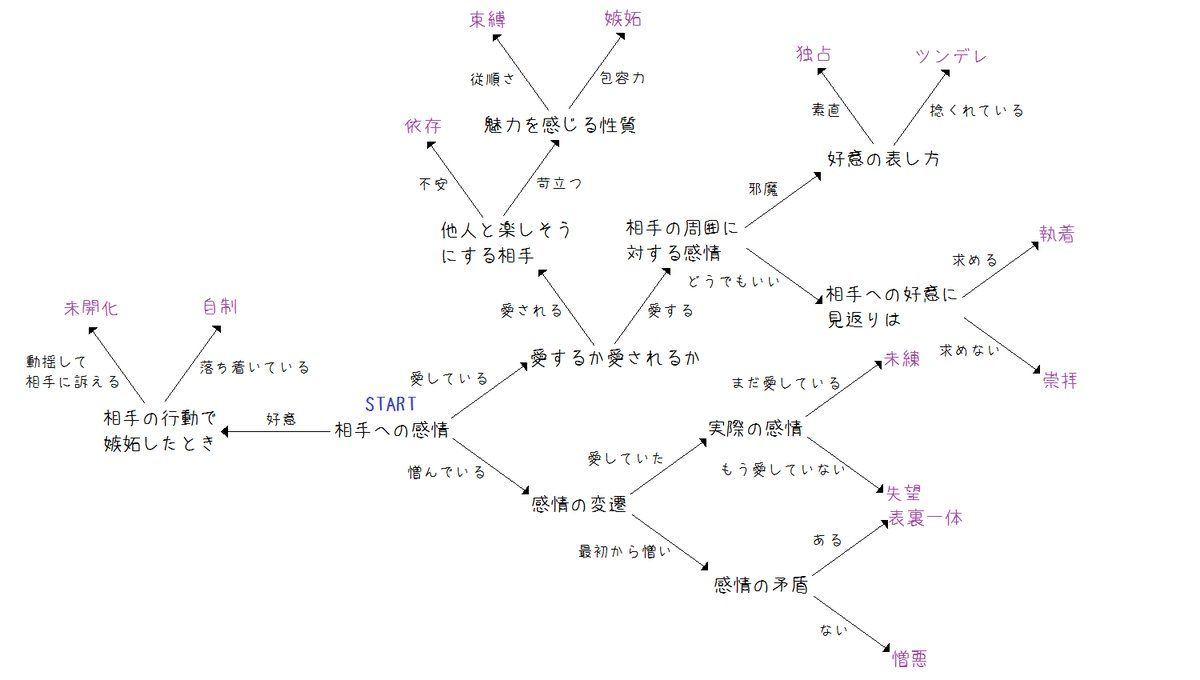 https://twitter.com/negame_03/status/852526669529206785/photo/1<<愛と好意の境目難しい>>・夏A対要さん→未練 (まだ信じたい)・要さん対安居→失望 (もう殺すしかないじゃない)※以下表記の左右に意味はありません・安居と茂→未開化(8巻)からの独占・依存・嫉妬・束縛 (お互い別分野で「助けてくれて当たり前」「助けるのが当たり前」) (お互い周囲に自分以外に新しく「相手を助ける人」が現れるとムッとする模様)・安居→涼:好意はある→だが特に嫉妬はしない 強いて言うなら花流れ事件・ハル見殺し事件で「涼がやった」ことへのツッコミがまるでないこと、嵐を助けようとしたけど涼に茂の件で止められたことに従った様子からすると「無自覚依存」「無自覚信望」が正しいのかも。・涼→安居:自制・ツンデレ・崇拝 (ただし求める見返りがないわけではない。「リーダーとしてのいつも通りの安居」で居てほしい、そのために「無様な安居」をサポートしているといった発言も見受けられる)・安居→要:崇拝(~17)→未練(18)→失望(卒業)