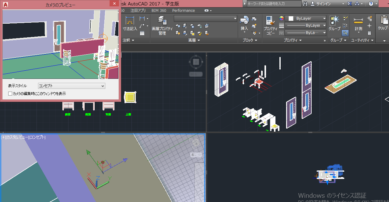 頑張ってchairとかのアイテム作る所まではできるようになったけど……あとの、ビューポートツールぜんっぜん使いこなせる気が……notthing...orzあんど、学校のでなく家でpcに入れた学生版cadで3dモデルが使えなくて練習もできない。つらい。カメラ、レンダリングもできるようになったのに、未だにビューポートツールでなくレンダリングやプリントスクリーンからのクリップばかり使ってる。ぐぬぬ。3dギズモちゃんのお役立ち度と分かりやすい度を見習えよビューポートツールちゃん!あと閉じた平面を一つの形にできて押出できるやつもラブ。あと3dでくりぬきコピーのやり方が分からずできないので代わりに差を使うのがマイブーム。良く固まる押出という敵、cad2dの頃からの宿敵ラインに沿う配列複写……も、克服……夏中に打倒……!!!!!!願望!!!!
