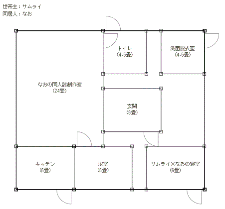 http://genzu.net/heimen/理想の部屋割りを導き出してくれる 建築平面図ジェネレータ直ちゃんの同人誌(恐らく手塚)+蔵書室の存在感。玄関の位置がそもそもおかしいですし、トイレに至っては何故か二箇所入る場所があります。洗面脱衣室は浴室から遠く離れた上に庭に向かって開き、当の浴室は直ちゃんの個人部屋からしか入れません。サムライ×なおという表記。わかってらっしゃいます。でも入る場所は外から直接です。恐らくいい雰囲気になる度に某お父さんや某妹や某友人達の邪魔が入るんですね分かります。まず一緒に寝るメンバーがおかしい。サムライとロン:おとんと末っ子。なおとヨンイル:おかんと(マザコン気味な)次男。この時点でまずおかしいんですが(おとんと次男が)レ イ ジ・・・!十中八九ロン「毎日毎日レイジが襲ってきて嫌なんだけど」直「僕と同じ寝室にするか?」ヨン「やめとけて。おかん力弱いし、サムライとロンを同じ部屋にしたらええんちゃう」ロン「寝室が6畳のしかないよな。14畳のあそこを使えればすごく助かるけど」ヨン「あそこは俺も使うし勘弁してや」帰って来た原作18歳組レイジ「!?」サムライ(不憫)「!!!?」閉鎖空間がいくつかあるので、おそらく線の薄いところはついたてかなにか。あと、ヨンイルのシャワー室どうした。浴室の2倍どうした。シャワー浴びてると龍が踊り狂うんでしょうか。それとも漫画の拳法の練習場と化すのでしょうか。しかもレイジの寝室の隣。おかしい。あと何気におかしいのがレイジとロンの生々しい部屋。どうした。本気でどうした。この後かぎやざきめぐみ、やすだを増やしたのですが何回やっても部屋割りがヨン&なお と サムライ&ロンになります。仕組まれているんだ・・・ !というか9章思い出すだろ!やめて!!7章でもサムライとロン相部屋っぽくなりましたがそれより9章の不憫コンビのあの重い空気が思い浮かびます・・!サムライをみつぐにした結果:みっちゃんぼっち。隣の会議室は恐らく自分会議用(煩悶部屋とも言う)。そしてレイジ僻地。ヨンイルは恐らく恵ちゃん部屋との間のドアを直ちゃんに封鎖されていそう。やすだ・めぐみが直ちゃんの共同部屋の隣な辺り愛を感じます。そしてやすださんは何を格納するのか。銃かジープかそれともアルバムか。食い込んできましたやすださん。直「何故安田がここに居る」サムライ「・・・・・・・・・・・・何故だ」安田「気にする必要はない」((無理を言うな))レイジ「強●魔が傍に居るんじゃ俺が四六時中見張ってなくちゃな!」ロン「お前が一番手ェ出して来てんじゃねーか!!」ユエ「半々も大変みたいだな弟よ」マオ「そうだなあんちゃん」リュウホウ「」ガイさん「飯よこせ」リュウホウ「」サッリュウホウ「・・・・・・」ガタブルガイさん「うめぇ」飯をみついでいれば恐らく大丈夫な筈。リュウホウ+タオリャンで相部屋になったことがありましたが、それは大丈夫・・なのかなー・・・・レイジとロンの工作室って何・・・ビバ「リョウさんっスか、変な部屋名つけたの!!」リョウ「いいじゃん。ジョークだよジョーク。本当にしちゃう・・・?」ビバ「変なことしないでくださいよ!僕はロザンナの愛撫に忙しいんスから!!」リョウ「ぐぬぬ」リュウホウをやすださんとコンビにした結果:ガイさんとタオリャンの寝室嫌な予感しかしないんですけどこれ。毎日死闘ですよね。確実にどっちか(主にガイさん)医務室送りですよね。ユエとマオのメインアリーナが恐らくガイさんの休憩所になりそうです。でも隣。怖い。ヨン「入れたってーや」直「・・・仕方がないな」サム「ぐぬぬ」ヨンを入れることで起きた新風:・タオさんの変な部屋が出来る。・ダイニングができる。tukkomikirenaio.........................rz