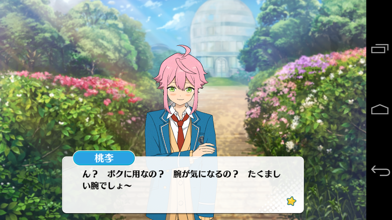 友達(※腐女子)に「これホモゲーじゃないからな。ないからな」って謎の紹介をされつつ始めたあんすた。・・・・・・そ、そうね・・・・・・私ここまで餌出されて食いつく腐女子ではないから若干戸惑ってるわ・・・・・・ヴァルキリーはヴァルキリー(メリバフラグ)っていうジャンルだから仕方ないと思うし、よく事情分からないけれど好き。兄弟同士仲良しだったり片方がもう片方をうざがっているっていうのはリアルでいいなあって思う。あと親子・擬似兄弟的な関係とか、師弟も好き。同じグループ同士でわいわいしてるのも可愛いなって思う。あと友人が「イベントではいきなり名前呼んでくるぞあいつら」って言ってたけど、実際イベント時は乙女ゲーなんだなあ…と実感する。でも初めて個別イベントを見た時のせなくんのゆうくんゆうくん(体育祭)とかびびった…。ゆうくんって誰どっちのゆうくんだよ…この子だけなんていうかすげえな…マイペースオブマイペースだなって思った。先日の、キャラクターポジションで追体験するっていうイベントの時は面白い趣向だなと思ったし、キャラクター同士の絡みは普通に好きです。当のゆうくんはどっかのアルっぽいなーと思ってたら思った以上にビクデレっぽい要素あったので個のキャラとしては興味深いです。あと、同じ小生意気枠の桃李くんがジャンル:桃李くんって感じでかわいくて好きです。親愛度ろくに上がらないと分かっていながら頭を撫でくりまわしたいんだけどドヤ顔もドヤ顔で可愛くて見たい。困った。奴隷2号にはまじかwwwってなったけど弓弦に差し出すとかほか選択肢で笑った。弓弦さんとのパワーバランスがいまいち分からんけど漫才みたいで面白い。あとこういう…なんつーか…アレな。あざといのにあざといだけじゃないっていうかそういうあざとさ好きですっていうか……お巡りさん…私です。もう私奴隷2号でいいや。・自称吸血鬼のじゃおに先輩は昔の姿と今の姿の間に何があった・抜刀斎最初期刀なのに未だに掴めない※アイドル※アイドル※アイドル・アドニスくんと抜刀斎の友情ストーリー読みたい ※なお強くなり帯刀斎の訓練に付き合い刃向けられるアドニス君・忍者も掴めないけどこいつら謎すぎてかわいい・掴めないけど江戸村かわいかった・忍者とダッシュダッシュは基本的にボケな分真顔モードの破壊力が高い・イベント我慢して貯めたダイヤで真白くん5出たんだけど完全に姫で何か違う…ってなったけど その後の王子の破壊力が凄くて(これがギャップ萌えか…)ってなった・Amazing楽しそうでなにより。分裂分裂・すお~くんはお姉さまみたいな庶民/一般の方、が口癖って印象しかなかったんだけど ロビンフッド一話で盛大に笑わせていただいた。・レオさん色々すごい・凛月くんのダウナー感結構好き・子ガラスちゃんに振り回されつつツッコミを入れる様がクロールかっこいい・羽風さんそこまで好きではないけどめんどくさくて毎回(用事に)つき合う選択すると「転校生ちゃんがつき合ってくれるなんてレアだ~!」って出てきてお、おうってなる・英智さんの昔の因縁に対する態度が見事に表情曇ってておおってなる。昔話読みたい・ダルデレ翠くんが野菜ネタで手抜かないのはすごいなって思う・創くんの坊主情報滅茶苦茶気になる。あと幼馴染話も・紅朗さんが色々イケメンってのは全面的に賛成。気を緩める時の嬉しそうな顔もクロウ人らしくてとても好き。そこまで苦労人ぶらないでお兄さんやってる所が倍率ドン。・予想つかない所でLUCK下げてくる子には正直星とろうとしてるときはイラッとくる・友人イチオシのはすみんがそうなんだけど筋トレと逃走への反応は可愛かった・みかくんのスペック(関西弁・コンビ・新入り・警戒心と許容のはざまうろうろ)が萌えドツボ・クロワッサン可愛い。マドモアゼルが可愛いのに不気味。だけどそういう若干不穏要素とツンツンモードがなんかどっちも可愛いなこの人…と思えてきた。・お姉様好き。でもお姉様のノリノリうっとり顔は正直あまり好きではない。シチュエーションがはっきりしてない時(★4カードのアレ)とかは特に、これギャグ漫画で見たって思ってしまう。しかしきゃっきゃ乙女モードとイケ姐貴モードがとても好き。オネエおこモードも可愛くてつい強そうな鏡を選択してしまう。女子校のノリ楽しい。・ダッシュダッシュかわいい。・熱血二人とダッシュでトリオ会話こないかなあ。・深海くんはちょいちょいホラーぶっこんでくる・王道転校生と王道生徒会副会長と書記を足したような感じで外見は好みなんだけどいまいち掴めないこの人。……じじポジか……?・↑に髪切れって言ってる割に「魔力は髪に宿る」っていう理由で納得してくれる夏目くんは魔術可愛い・佐賀美先生のお茶への発言可愛い・椚先生に会う時は大抵フィーバー目当てかうっかりだからそこまで会ってないし、一番上がる選択肢も分からんけど叱り方が割と