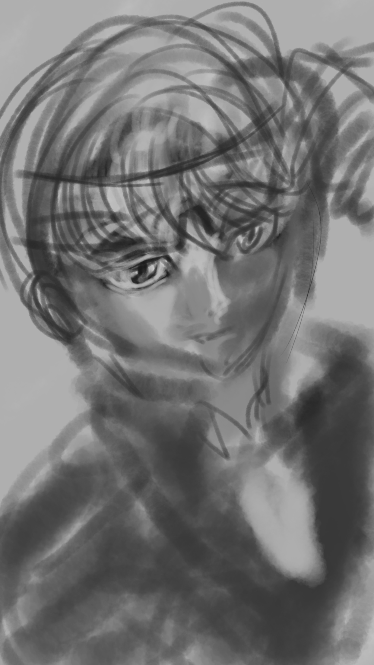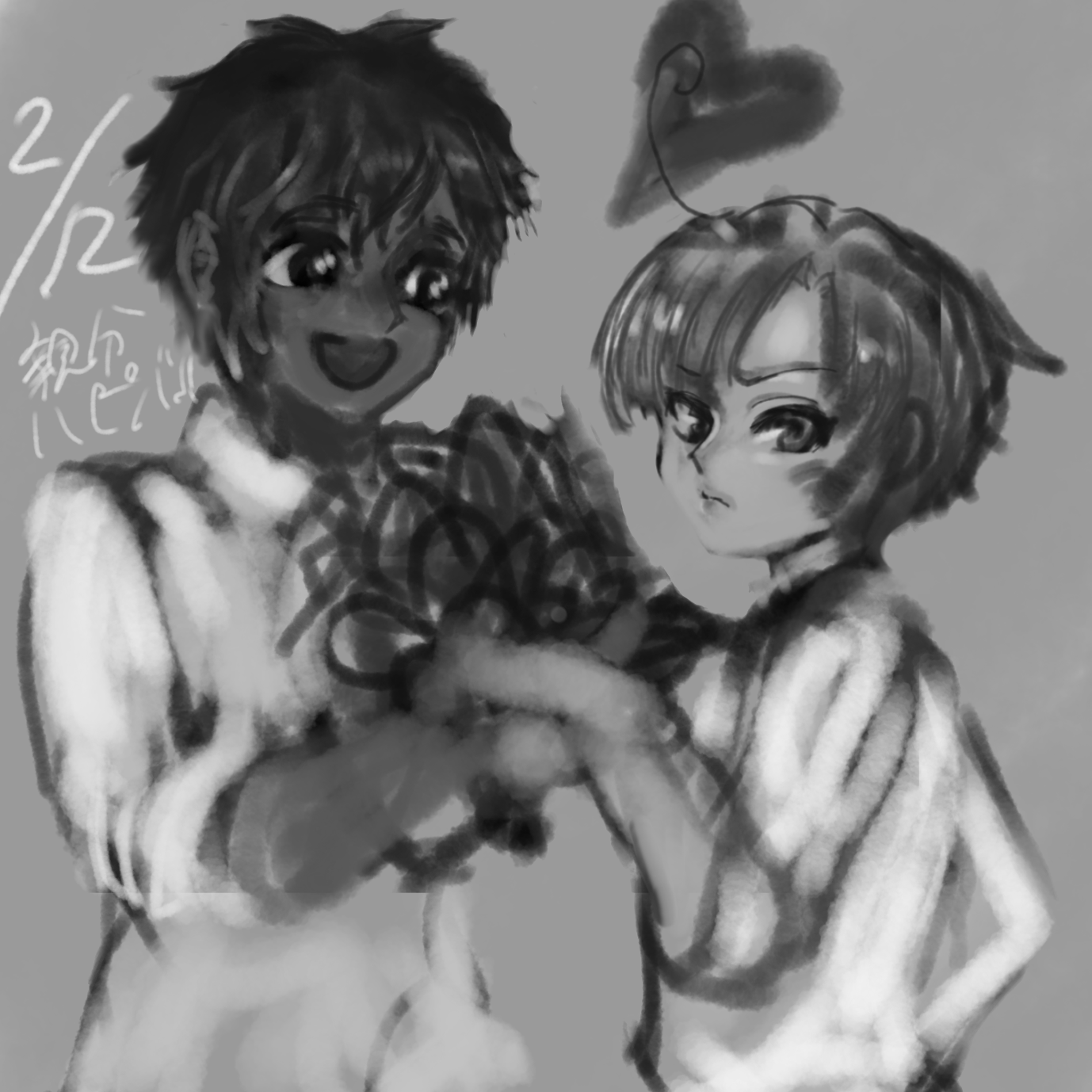 何気に親分まともに描くの初めてで何度もこれじゃないになりました親分描きなおしたところ・くせっけだが頭頂部は割りと落ち着いてる・胸元リボン・眉頭がちょっとふわっとしてる、垂れ目・前髪は結構すっきりしていて向かって右側が分け目(子分と同じ)