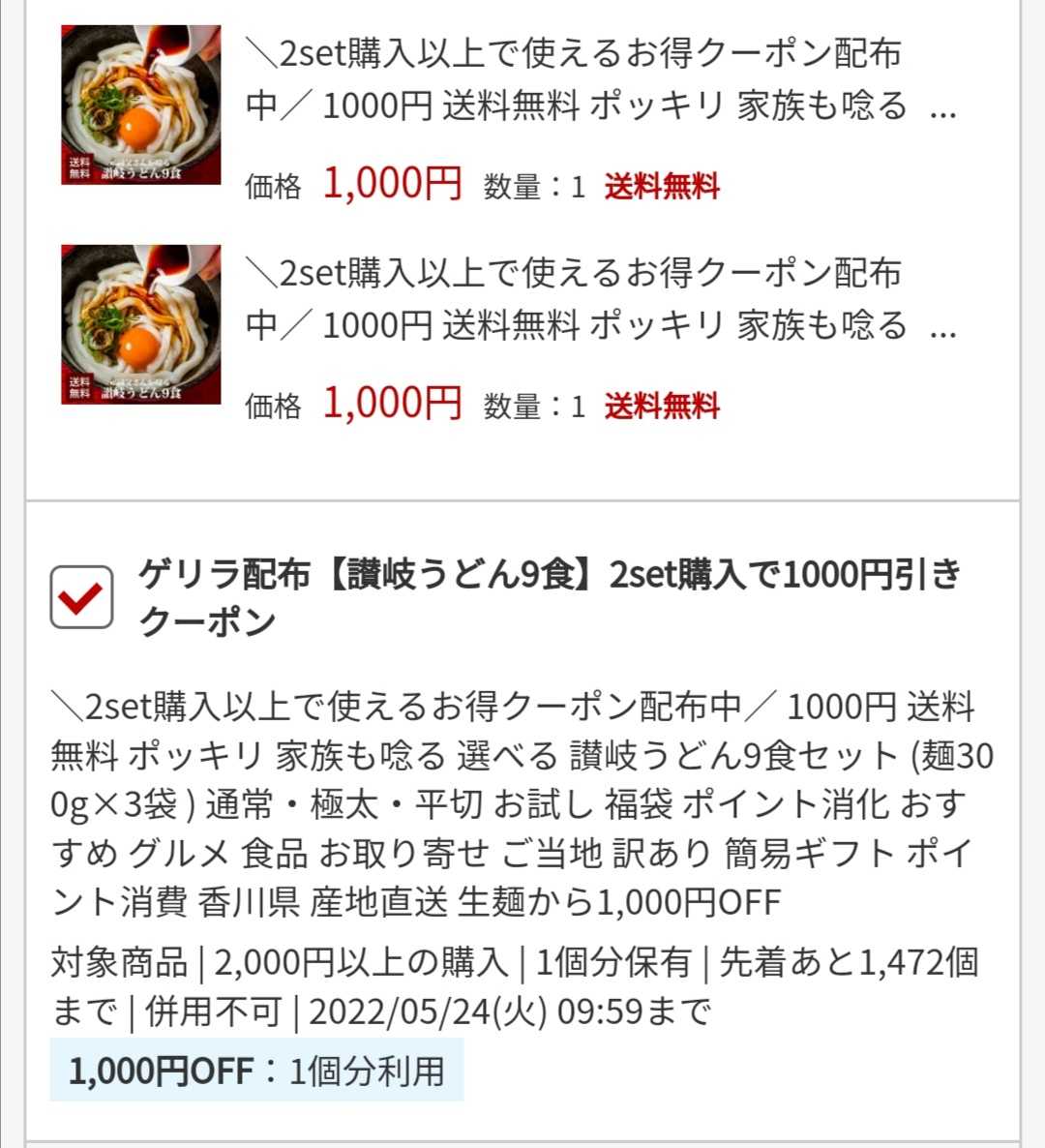 まだマラソンは続いていますが、ポチしたものをまとめておきます(´-`*)23日にポチしたもの。1店舗目 ニッセン 楽天市場店マラソン開始2時間限定25%OFFクーポンを使用して娘の水泳授業で必要なものをポチ。初めての水泳授業なので手探りです(;´∀`)ラップタオル すみっコぐらし 制菌加工 紫外線遮蔽加工 ブルー 80cm丈 ニッセン nissen水着 キッズ 女の子 FILA ワンピース ネイビー×サックス/ブラック 身長130/140/150/160/170cm ニッセン nissen身長130㎝弱、標準体型でネイビー×サックス140㎝にしました。2店舗目 クオリティファースト 楽天市場店マラソン開始2時間限定50%OFFクーポンを使用してシートマスクなどをポチ。昨日届きました。【50枚セット】シートマスク パック 大容量 日本 福袋 クオリティファースト オールインワンシートマスク ホワイト30枚入り ベスト20枚入り フェイスマスク シートマスク フェイスパック パック 日本製 国産 敏感肌 美容 マスクパック スキンケア マスクシート 大容量【20%クーポン有】フェイスパック 【マスク擦れ マスク蒸れ対策】ナイトスリーピングマスク 80g クイーンズプレミアムマスク フェイスパック ナイト パック 敏感肌 マスク ジェル クリーム 夜用 LDK プチプラ ベスコス ビタミンE エイジングケア 2個 送料無料3店舗目 パティスリー銀座千疋屋楽天市場店訳ありの銀座アップルクーヘンを1,944円でポチ。こちらは通常バージョン。お買い物マラソン限定ポイント10倍〜 父の日 千疋屋 焼き菓子 パティスリー銀座千疋屋 ギフト Gift 贈り物 送料無料 銀座アップルクーヘン24日にポチしたもの。4店舗目 グルマンデ2set購入で1000円引きクーポンを使用して、通常麺と平切麺をポチ。1000円OFFクーポンはゲリラ配布って書いてあったので今はない?私がポチした時はポイント20倍じゃなかったような。ポイント20倍 1000円 送料無料 ポッキリ 家族も唸る 選べる 讃岐うどん9食セット (麺300g×3袋 ) 通常・極太・平切 お試し 福袋 ポイント消化 おすすめ グルメ 食品 お取り寄せ ご当地 訳あり 簡易ギフト ポイント消費 香川県 産地直送 生麺 2set購入で使えるクーポン配布中25日にポチしたもの。5店舗目 楽券ショップDEAL10%の時に2つポチ。【楽券】サーティワン アイスクリーム 500円 デジタルギフト 1枚6店舗目 楽天242点以上、7,000円以上購入で使える10%OFFクーポンを使用して、日用品などをポチ。キレイキレイ 除菌ウェットシート アルコールタイプ(30枚入*12袋セット)【キレイキレイ】クリアケア リンス&ゴー(360ml)ポチした時より3円安くなってます(^_^;)バンドエイド キズパワーパッド ひじ・ひざ用(3枚入*2コセット)【バンドエイド(BAND-AID)】[絆創膏]10連スライド式ハンガー F-13(1コ入)純粋カナダ産はちみつ(400g)プロポリスキャンディー(100g)【イチオシ】【森川健康堂】ヒガシマル醤油 うどんスープ(20袋入)【イチオシ】【ヒガシマル】