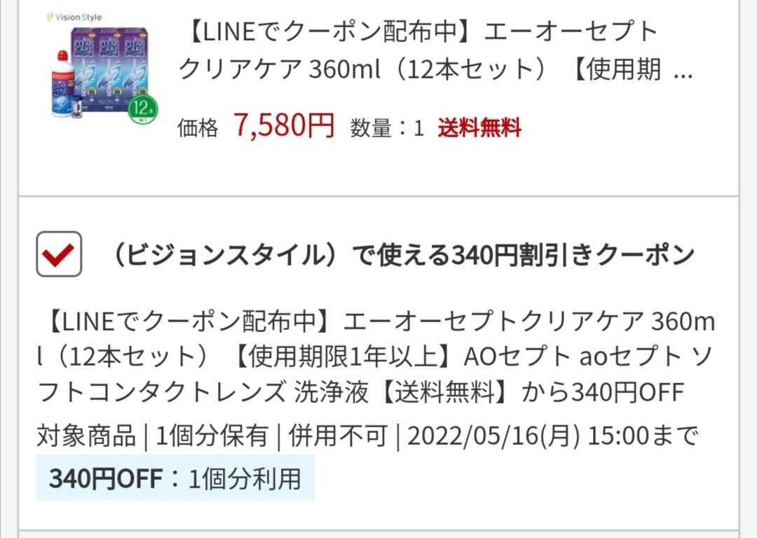 昨日ですがビジョンスタイルさんでこちらをポチ。商品を検索している時に上の方にこちらのクーポンが出てきました。以前購入したことがあるから??【LINEでクーポン配布中】エーオーセプトクリアケア 360ml(12本セット)【使用期限1年以上】AOセプト aoセプト ソフトコンタクトレンズ 洗浄液【送料無料】我が家は夫と私、それぞれ使うのでこれで半年もつのですが、つい最近買った気がするのにもう半年も経ったのかーと月日の流れのはやさにビックリ。コンタクトを使うようになると色々とお金がかかるし、何より不便だし子どもたちには同じ思いをしてほしくないなあ。視力には関係ないですが、娘は先月からアイボン使い始めています。【第3類医薬品】【小林製薬】アイボンクール 500ml【RCP】ドラッグストアで一緒に選びました。寝起きの目やににイライラしていたのですがアイボンをするようになって落ち着きました。