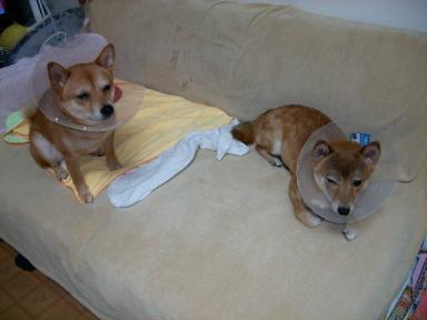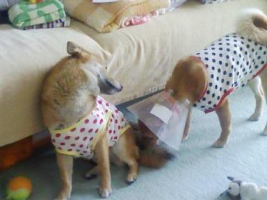 忙しくて今頃の更新ですはなマルは、9日の夕方退院しました。ん...させられたの間違いかしら?スタッフさん曰く、3日目からは元気に鳴いてるって言ってたので3日目の面会では、ハーネスつけたはなマルとなるぽんはお散歩なんせはなマルはお外でウ○チ派ですし初入院でウ○チは我慢していたようですヒヤー、ハーネスが傷にあたりそうぉぉぉヒヤヒヤしながら、無事にお散歩終了2回も上等なウ○チをしてくれました「抜糸は、2週間あけたいので、それまで入院するか 昼間だけ預かりにするか相談してみてください」二人は仕事がありますし、またしてもマルの時のように保育園状態かぁ問題を抱えるなるぽん・まあぽん一家に、「なんでも任せなさいの匠」まあぽんママが「昼間ははなマルをウチに連れてきて、傷を癒すことに専念させよう! 任せなさい」なんということでしょう...この発言で我が家は保育園問題を解決したのです(ビフォアーアフター調)退院した9日は、すごい嬉しかったです。4日ぶりに会うまあぽんの気持ちは超嬉しいだったと思います。「はなマルちゃんの傷なんだけど、エリアベスカラーだとあたるんだよね~」診察台の上で、先生がカラーを持ってあれこれやってくれます。首には、カラーが当たって出来た赤い部分がありました「先生、これはどうでしょうか?」ポケットから、ハンドタオルを半分に折って作った三角巾を出しました「あぁ~、これでいいじゃないですか」先生のが出て無事に解決です10日から15日まで、まあぽんママが大活躍でした朝は、はなマルはまあぽんの実家に移動マルのいない一人っ子生活を満喫していたようですおやつもとられなーいガウガウされなーいグッスリ眠れるzzzzまあぽんママのおかげで、はなマルはゆっくり出来たようですまあぽんママ、ありがとうございましたはなマルは、本当は一人っ子がいいの??でもね、マルは一人のお留守番を我慢して待ってたよまあぽんママがはなマルを連れていく姿を見送りながらちゃんと待っててくれました。ものがわがるマルにとっては淋しかったと思います。私たちが帰宅すると、すごく嬉しそうにしていたのでよくわかりましたありがとうね、マルちゃんこの一週間、マルはガウガウしなかったし、はなマルも傷を掻かないので別々は一週間で終わり2週目から、マルと一緒にお留守番してね今週は、無事に抜糸も終わってひと安心です抜糸したよーーー二人だと楽しいよん