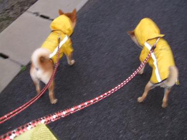 今朝は、雨のお散歩でしたぁ雨のお散歩は、なるぽんの悩みですだって、マルが「足が濡れるのイヤでしゅ」と、抵抗するからです今日も、やっぱり抵抗されました。新しい777円のレインコートを着て、なぜか途中まで抱っこのマルはなマルは、ぜんぜんお構いなしにお散歩を楽しみます。途中でマルを降ろしてズルズル引きずられていましたが「帰るよ~」の一言で、元気に歩き出しました。お揃いでしゅしっぽで、二人はわかります雨はキライあたちは平気よん明日は天気だといいなぁ~