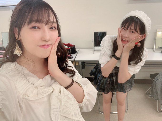 久々の遠征公演(ハロコン2020冬以来)で、いつもは新幹線で爆睡しているのに、今回は一睡も出来なかったというフクちゃん。歌う順番のAチームの抽選では、何と1番を引いてしまったそうで、緊張続きで大丈夫だったかなぁ・・・?(笑)画像は、同じAチームでトリを引いてしまったというそれでも笑顔のほまちゃんと・・・。