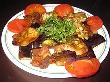 6・・4のフライパンに、5のナスの皮目を下に並べ、弱火にかけます。表面に油が回ったら、裏返して、少し火を強めます。何度か裏返して、両面ともコンガリ焼き色がついたら、ナスを箸などで押してみてください。 お好みの軟らかさなら、火から下ろして皿に盛ります。(極柔らかいナスがお好きなら、蓋をして弱火で蒸し焼きにして下さい)