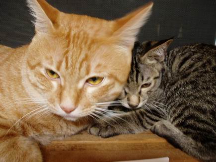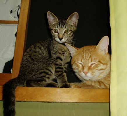 知人の獣医殿から、「また、お仲間が増えたんですか。・・・・・・私としては「幸多い動物が増えることに意義はありません」が、・・・・・いったい何頭にするおつもりですか。・・・・・・先の2頭はタペタムが奇麗なんでしょうね。後のは「サーバル」でしょうか。・・」って、メール可愛く撮れたジュダ君と、ミルミルと、そしてダヤンの写真を見せびらかした。むむ「タペタム」なんだべ急いで検索 「ネコには網膜の裏側に「タペタム」という層があり、反射板のような役割をして・・・」ふーん・・・「サーバル」ふむむむむさーばるっちゃー、サーバルキャットのサーバルかいなそーねー、ダヤンはお耳がでっかくて小顔の可愛いにゃんこだけどぉ なんぞワケ解らんこと言わはるなぁ・・・幸いにもウチのにゃんちゃんたち、三者三様の性格で、テリトリー争いもせず、仲よくじゃれてる毎日。後に来た、ちびちゃんダヤンやんちゃながら、お兄ちゃんたちは上手に遊んでくれてる。あまり頭数が増えてもスペースに限度があるし、今の状態がベストかなー。ちょうどよいバランスで暮らせている気がするなー。昨夜も、窓辺でジュダ君とダヤンを発見姫たちとアタクシは、その様子を飽きもせず眺めてうっとり仲良しって嬉しいねぇのんびりとさ、自由気ままにさ、くつろいだ風情ですごしてくれるにゃんちゃん。いつも一緒に暮らせてること、すんごいシアワセなんだよねー当たり前に感じて、忘れちゃいそうになるけど、これって、すんごいシアワセなんだよね~季節の変わり目、みんなで気遣いあって、みんなで元気にすごそうぜぃここに幸あ~り、あおぉいいそぉぉらぁぁ・・・・いや、今朝からバケツひっくり返したよーな土砂降りだちゅううねんすげぇ、降ったぜ