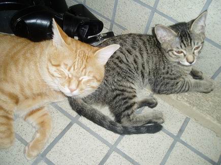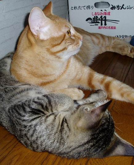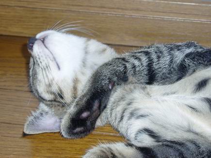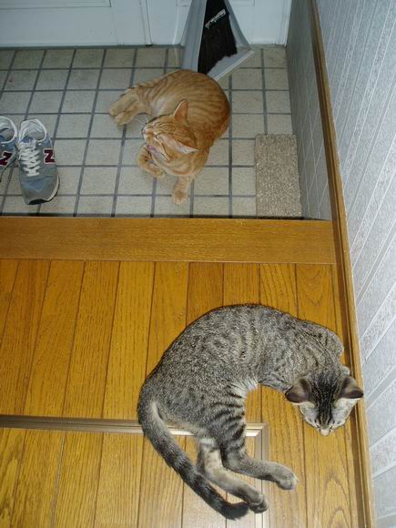会社から帰ってドアを開けると、そこには眠りこけたまま動かないにゃんこたち。いつもなら、ささーっと退散するのに、よほど眠いとみえる見れば、ジュダがダヤンのちっちゃいおしりにでっかいお顔を乗せている。ちょっと(かなり)重そーな表情のダヤン君。じーっと見つめてると、あっずりおちた(ずりおとした?!)あははははやっとウトウト、いっしょにお昼寝の続きだねぇくーかくーか、熟睡するジュダくん。さてさて、くだんのミルミルはどこにおるのだっ