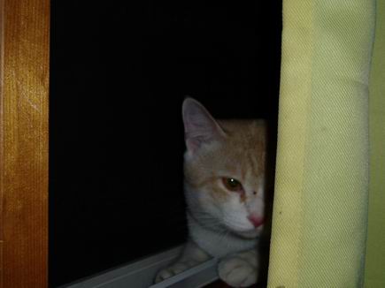 ちょっと涼しくなったかなーと思いきや、ぬか喜びだったらしい・・・やっとミルミルが、昼間も姿を現すようになってきたのに。でもさ、今夜は写真も撮れた玄関でくつろぐミルミルだっぴああ、なんて可愛いのでせうっぢっと見つめて、・・・・・逃げられた気を取り直して、ジュダくん探し。いたいた、いつもの冷蔵庫前。冷蔵庫近くは、放熱してないかい横なんて、ちょー熱いぜぃいろんな電化製品の発火事故もあるしさー、物持ちのよい ( しぶとくつかい倒す?! )アタクシの家も、ちょっと戦々恐々よだが、ジュダくんはとてもくつろいだ風情でここに・・・おわす。いやー、いつも男前だねぇきりっとしてて、大好きだわ、そのおカオそれに引き換え、ダヤン君。可愛いお顔、パッチリお目目、愛くるしい美形なくせにさーキミはどーしてこんなにも、写真写りが悪いんだっ
