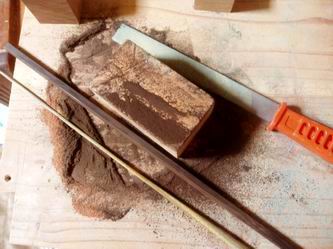 (前回の様子)先日のお稽古のとき、春のコンサートのことで、直接せんせーとお話できたさ。んで、せんせーったら、休憩時間なのに、タクト(指揮棒)を離さずもったまま「おっ」とめざとく見つけて、持たせていただいたさ。ふうむ、案外軽いぢゃんふうむ、案外細いんだ・・・グリップの形状も見れたっコルクだった。シャフトの先はささくれ、コルクには指のあと。ほー、こんな風なモンだったのねと、感心しきり。センセー曰く、「もうちょっと軸が太い方がいい」「持ち手はこの形が一番持ちやすいかなー」さようでっかよっしゃ、ご希望に添いたいぞっんで、今日も磨いては削り、削ってはまた磨き、まっつぐなまんま、少しづつ少しづつ自然に細く・・・・地味にコシュコシュやっとりますいい感じになってきたんぢゃないかいなしかし、重いどこりゃ手首が鍛えられる重量感だべさ。さらにグリップも付くのにさぁぁぁぁねじりでも盛り込んで、軽量化に努めるかな・・・・そんな芸当が、アタクシにできるのかいな・・・せや、グリップの接合方法はさ、大工さんに質問したさ。そしたらさ、「鉛筆の先のように、テイパー状に雄と雌を作って・・・・云々」うげぇなんじゃそりゃでも、今度道具と方法教えてもらうことになってるさ。いやー、なんだかオモロイ展開だべさ。また知らんこと教えてもらえるぞっなんだかワクワクしちまうなー