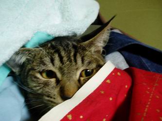 このところ、夜になると寒くって・・・分厚い靴下はいて、重ね着して震えてるアタクシは、ものすんごい寒がりなのだっこんな秋のうちから寒がっていたら、真冬が思いやられるわい・・・にゃんちゃんを抱っこしたら温そうで、みゅぎゅんってしたいのにちっとも落ち着いて抱かれてくんないの姫たちと、何が違うというんだーで、ふと見るとダヤン君が衣類の山に潜ってまどろんでいたさいかにも寒そうだ・・・自分でそこに潜ったのかそれとも誰かが上からかぶせたのかいあはははは、キミも寒いかっ一緒にこの冬乗り越えよーぜい明日ホットカーペット出そっと