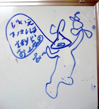 なにやらホワイトボードに書いてるなーと思ったら、やっぱしこのキャラだっぴかわいくねーよく見ると、吹き出しに書いてあるのは子守唄だったアノ曲だっちび姫は、いまだにフルコーラスで歌えちゃうこの曲。しか~し、びみょ~に歌詞がヘン「あなたは遊びのつもりでも」が「アナタガワタシノつもりでも」になっとるっ意味わからずにチビッコがこーゆー唄歌っちまうのもなかなかオモロイちなみに、「愛の賛歌」も歌えちゃうぞ、ちび姫。「ここに幸あり」も教えたぞ。乳児のころから耳元で歌いまくったぞがははははは。たのむから、他所で歌わんといてね・・・・