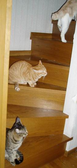 おっきい姫が声をひそめて、「かーひゃん、ちょっとちょっと」って、手招きするさ。ん?って近づくと、階段でジュダくん、ミーちゃん、ダヤンの順で綺麗に3段に固まって横たわってたさこりゃ~撮らねばっって、急いでそーっとカメラを向けたらだーっって、だーっって、やっぱしミーちゃんが逃げちゃったえーん3色そろった君たちは、すんごく綺麗で嬉しいのにぃぃぃぃいつか絶対撮るっ