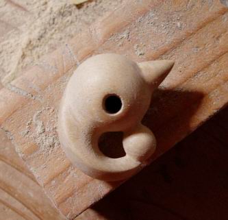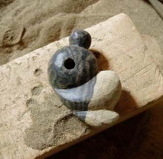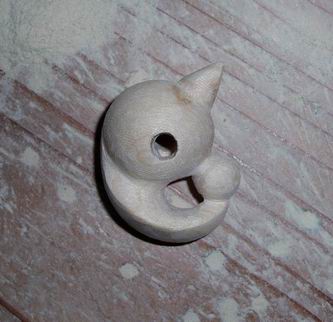 勾玉ってなにさ?!(その1)のつづき・・・・なんぢゃろ、これ。ぢぇんぢぇんわけわかんないままやけど、なんだか夢中になっとる【勾玉】ちゃ~、一体何だべさ????ってなことで、ちょこっと調べてみましてん。まず出てくるのが「三種の神器」のひとつ、八尺瓊勾玉(やさかにのまがたま)っていう記述。奈良の石上神社(物部氏の総氏神)に祀られている、「十種の神宝(とくさのかんだから)」にも玉がでてくるとさ。・・・生玉(いくたま)死返玉(まかるかえしのたま) 足玉(たるたま)道返玉(ちがえしのたま)・・・んで「玉」ちゃ~、「魂」のこととも、「宝石」特にヒスイのことをいうとも書いてある。身につけるために孔(穿孔:穴)を開けたC字の形に曲がった「玉」やし「曲玉」で、曲がるという字に悪い意味があるから、「勾玉」と書くのが一般的だとも書いてあるさ。ヒスイで作られた位の高い人の装飾品らしいねぇ。「玉(宝石)=魂(霊魂)」をたくさん身につけたら、特殊な力が得られちゃうって考えたんだとさ。魔よけやったり、幸運を招くためやったり、護符やったり、呪術の道具やったり、地位や権力や財力の象徴として、いっぱい身に着けて飾られていたり。石やし、硬いわなぁ。加工が大変やわなぁ。とうぜん材も、加工品も貴重やわなぁ。綺麗やし、形も神秘的やし、珍しいし、そら、欲しいって思うわなぁ・・・。カタチはね、道教の陰陽図と同じ形だ・・・とか、動物の歯牙の形だとか、(勾玉の材料として用いて加工したから勾玉の原型に?)胎児(すべてのものの始まりのカタチ)を表すだとか、魚だとか、三日月だとか、太陽と月が重なり合ったカタチだとか、腎臓のカタチだとか・・・諸説あるらしいねぇ。うむ、どれもにゃるへそと思えるのぅ。真ん丸い「玉」の穴にエネルギーを溜めてさ、そのエネルギーを放出する姿がね、あの「円い頭に尻尾」のついたようなカタチだぜっていう説明もあったよん♪いろんなカタチあるんだとさ。頭に横に貫く孔のほかにも、頭部からしっぽに向かって貫通する縦孔のものやら、頭としっぽが繋がったもの、二個の勾玉が寄り添うように削りだしたもの、全体に斜めの線が刻まれたもの、周囲にちっこい勾玉状の突起つけたもの、内側にちっこい勾玉状の突起のくっついた子持ちのもの、細長いものやら、球に近い形のもんやら、孔(穴)も、頭の真ん中にあいてたり、偏った位置にあいてたり・・・・なんですと。ニャンたまや、くるりん縞ちゃんや、アンテナつきやら、ピーナッツみたいなんやら、鳥さんみたいのやら、耳のあるのやら、しっぽつきやら、ヘンなカタチの「勾玉もどき」創ったけど、あながち、むちゃくちゃでもなかったんかもしれまへんなぁちゅーか、大昔のヒトが手でこしらえたんだし、イメージすることは共通ちゅうことかな。どーやら、日本独自に発達した不思議なカタチの「玉」らしいぜぃ面白いねぇ・・・興味深いねぇ・・・んだども、なんで勾玉つくりたいんか、それはワカランまんまやぬほほほほーいいの、愉しいモンそんなけやんってなことで、「勾玉ってなにさ」めでたく【完】自称、勝手に応援隊長 大好きなの・・・うふ