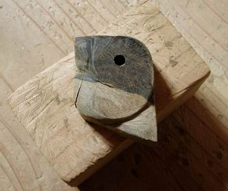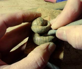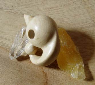 11月にこしらえた黒檀のシャフト、グリップをそれから何個創ったか・・・どうにも巧くいかないし、巧くいってもカタチが気に入らなかったり、なんだか納得行かないまんま、落ち着かないまんま。んで、やっぱしとゆーか、縞ちゃんの材を手にとって、今度こそはっって削り始めたのが昨日。こないだ削ってた黒ちゃん勾玉が硬かったもんだから、縞ちゃんの柔らかさに感涙さくさくカタチが見えてきて、5mmの径の穴も巧くいきましてんっそれでもなんだか足りない気がして、眺めてたそしたらさ、ピカって思いついたのよそーよ、「愛が足りないわ」構えたときに指が当たるところをくぼませることにしたっ縞模様の綺麗な裏側に親指のくぼみ、模様のない盛り上がった方に人さし指と中指のくぼみ、んで、シャフトを接続するとこ~んなふう明日はもうちょっと綺麗なナチュラルなくぼみにしよっとっやっと完成にこぎつけそうだ・・・自称、勝手に応援隊長 大好きなの・・・うふ